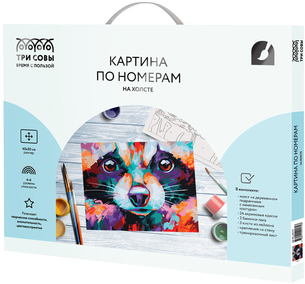 • холст на деревянном подрамнике 40×50 с нанесенным контуром, пронумерованный в соответствии с номерами красок. Контур под раскрашивание нанесен в том числе и на торцы подрамника, что позволяет разместить готовую работу на стене не обрамляя в багет или раму. Технология точной разбивки сюжета картины на разные цветовые оттенки гарантируют правильность исполнения полотна;