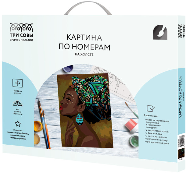 • холст на деревянном подрамнике 40×50 с нанесенным контуром, пронумерованный в соответствии с номерами красок. Контур под раскрашивание нанесен в том числе и на торцы подрамника, что позволяет разместить готовую работу на стене не обрамляя в багет или раму. Технология точной разбивки сюжета картины на разные цветовые оттенки гарантируют правильность исполнения полотна;