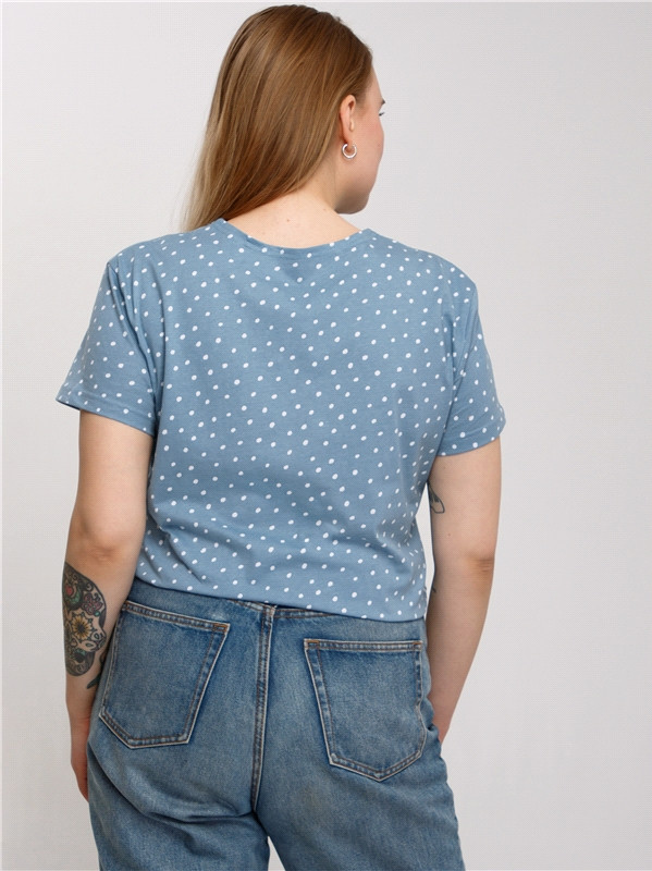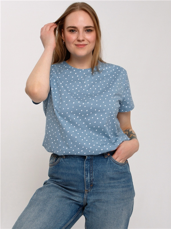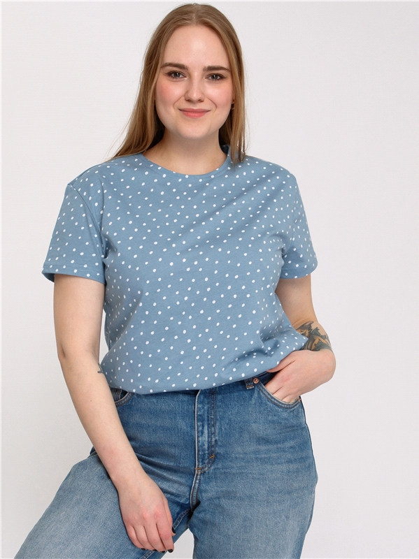 Футболка в мелкий белый горох 56 раз.- у меня ОГ= 112см- облегает нормально. Паз закрывает. Для тех, у кого полная рука- ширина рукава внизу = 36 см, длина= 22см. Цвет освежает, мне понравилась очень- очень. Рекомендую