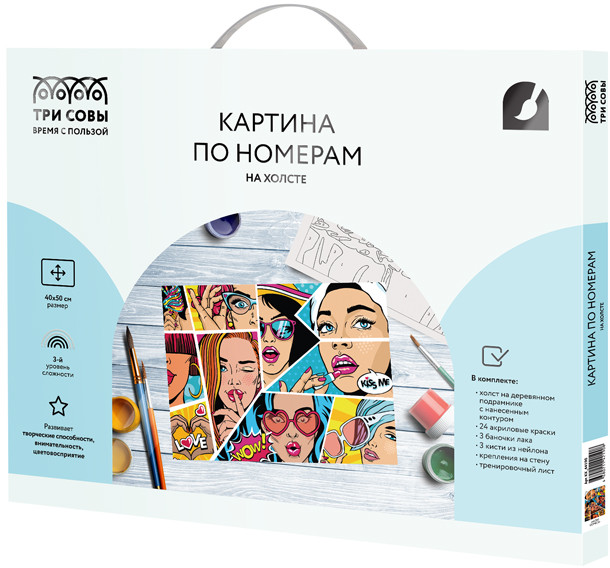 • холст на деревянном подрамнике 40×50 с нанесенным контуром, пронумерованный в соответствии с номерами красок. Контур под раскрашивание нанесен в том числе и на торцы подрамника, что позволяет разместить готовую работу на стене не обрамляя в багет или раму. Технология точной разбивки сюжета картины на разные цветовые оттенки гарантируют правильность исполнения полотна;
