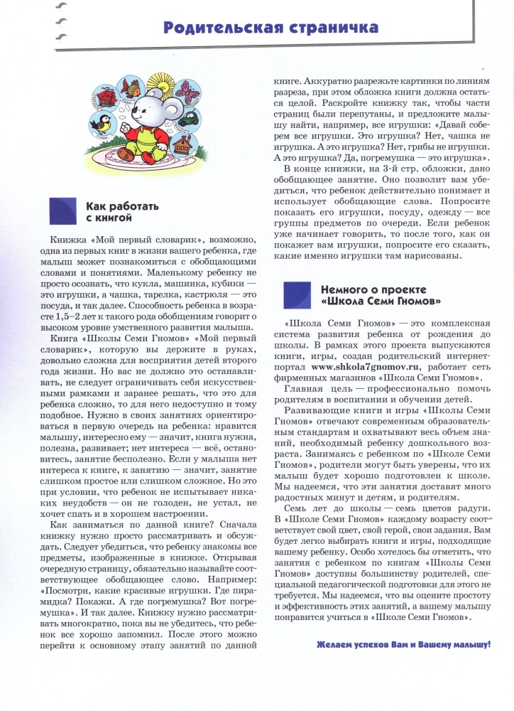 Цель этой книги – познакомить ребенка с обобщающими словами и понятиями. Оцените, это разработано для малышей от года до двух. Она не простая и родителям тоже придется потрудиться, чтобы объяснить ребенку, что есть что. Построена книга так, на каждой странице нарисовано несколько предметов, объединенных одним понятием, например, посуда, одежда, машины и проч. Далее, когда малыш рассмотрит и относительно запомнит всю книгу, ее предстоит разрезать так, чтобы потом вместе с малышом отыскивать слова – картинки, входящие в одну группу. Все книги «школы семи гномов» очень яркие, ориентированы на определенный возраст. Проверено, нужные и интересные пособия.