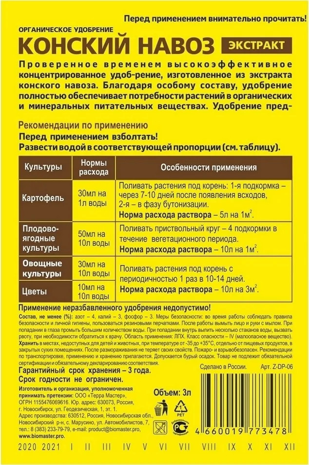 название подразумевает наличие в ёмкости концентрата конского навоза. по факту же ничего общего с навозом не наблюдается. Жидкость абсолютно без запаха навоза, темного цвета, больше напоминает гумат. С конским навозом нет ничего общего. Обман покупателей налицо