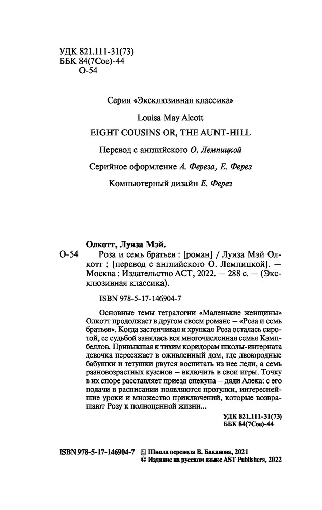 💳 Оплатить за товар можно при получении 🇰🇿 Есть бесплатная доставка по Казахстану 🎁 Копите бонусы с каждой покупки Серия: Эксклюзивная классика Основные темы тетралогии «Маленькие женщины» Олкотт продолжает в другом своем романе — «Роза и семь братьев». Когда застенчивая и хрупкая Роза осталась сиротой, ее судьбой занялась вся многочисленная семья Кэмпбеллов. Привыкшая к тихим коридорам школы-интерната девочка переезжает в оживленный дом, где двоюродные бабушки и тетушки рвутся воспитать из нее леди, а семь разновозрастных кузенов — включить в свои игры. Точку в их споре расставляет приезд опекуна — дяди Алека: с его подачи в расписании появляются прогулки, интереснейшие уроки и множество приключений, которые возвращают Розу к полноценной жизни... |
