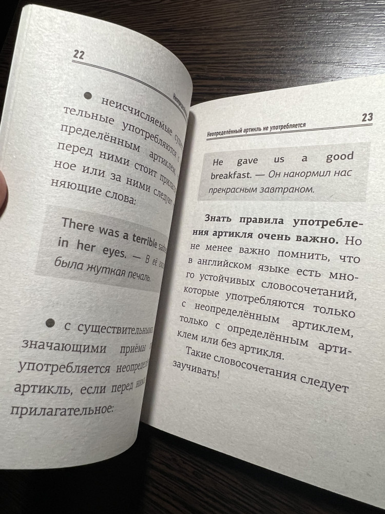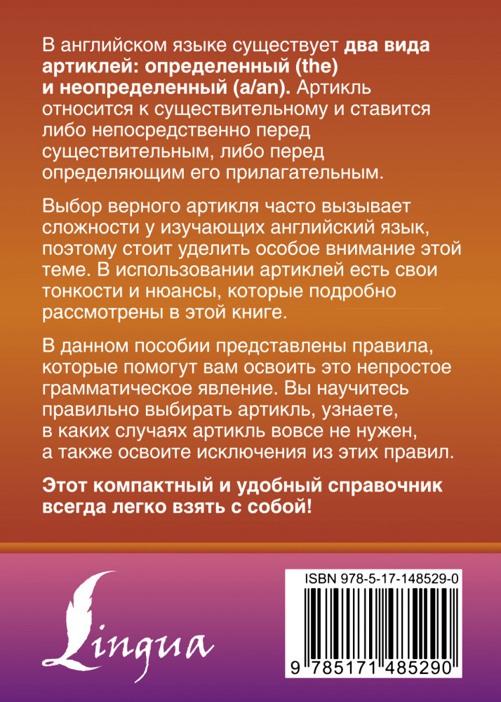 Отдельные главы о том когда неопределенный артикль применяется, когда - нет, устойчивые сочетания с артиклем. Главы об определенном артикле- когда используется, когда нет и в устойчивых сочетаниях, устойчивые сочетания без артикля. Формат в четверть альбомного листа.