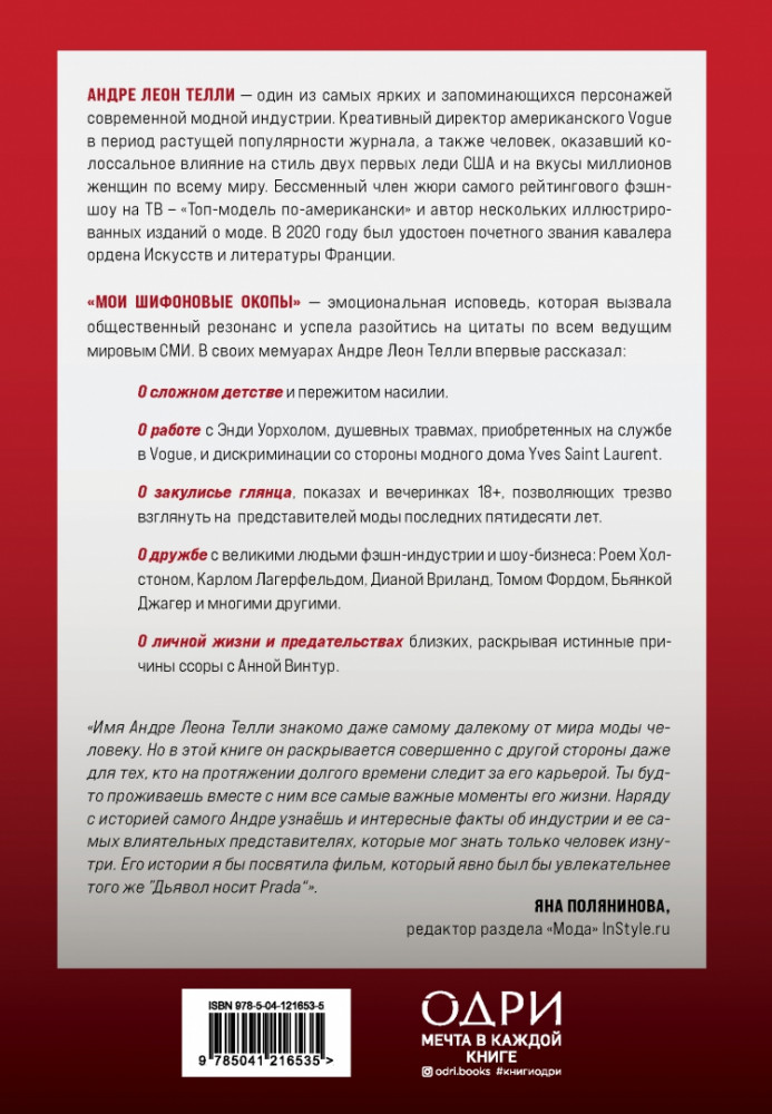 Мои шифоновые окопы. Мемуары легенды VogueВ данный момент этот товар отсутствует в продаже. Возможно, у нас найдется аналогичный или похожий товар здесь. Серия: Мода. Truestory Андре Леон Телли — один из самых ярких и запоминающихся персонажей современной модной индустрии. Креативный директор американского Vogue в период растущей популярности журнала, а также человек, оказавший колоссальное влияние на стиль двух первых леди США и на вкусы миллионов женщин по всему миру. Бессменный член жюри самого рейтингового фэшн-шоу на ТВ — «Топ-модель по-американски» и автор нескольких иллюстрированных изданий о моде. В 2020 году был удостоен почетного звания кавалера ордена Искусств и литературы Франции. |