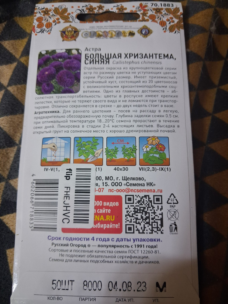 Семена упаковпны еще 04.08.23г.Неизвестно когда были собраны.Астра быстро терчет всхожесть.Хорошо ,если из 50шт.семян,взойдут 5.