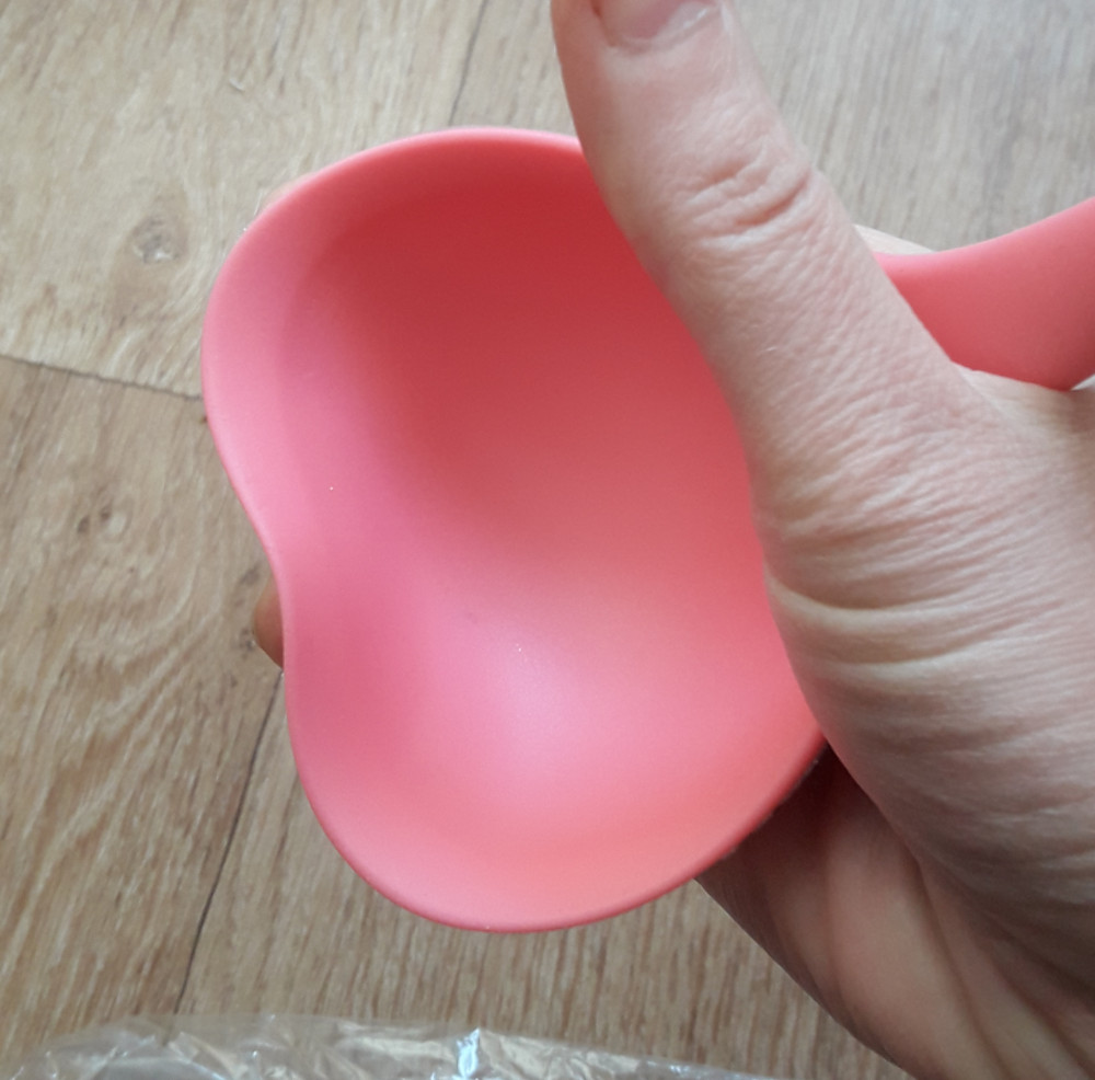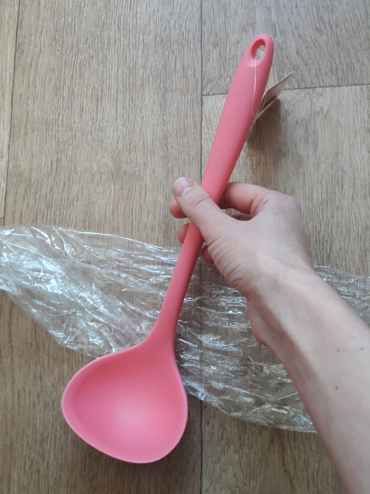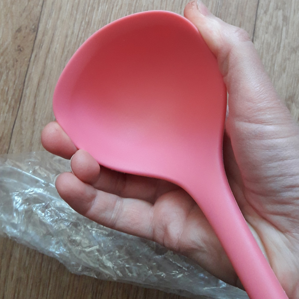 На фото постаралась понажимать на нее, чтобы показать эластичность. Отличная поварешка, внутри жесткий нейлон, не металл, поэтому самая оптимальная гибкость/жесткость при надежном сцеплении нейлона с силиконом. На краю мягкое, чтобы собрать с любой поверхности, краешек немного заострен. У свекрови была аналогичная, заказала еще маме, эта такая же.