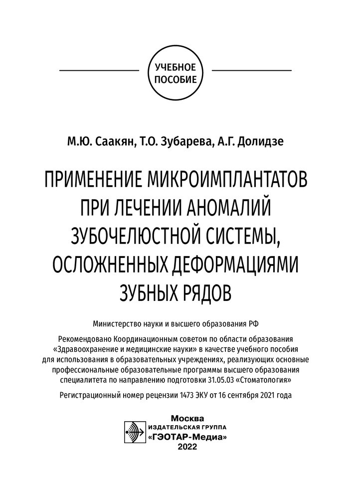 В учебном пособии рассмотрены причины появления микроимплантатов, их виды, показания к применению, способы установки. Даны рекомендации по диагностике аномалий положения зубов, осложнённых деформациями зубных рядов и использованию микроимплантатов в разных клинических ситуациях, продемонстрирована эффективность такого ортодонтического лечения. Приведены клинические примеры ортодонтического лечения с помощью микроимплантатов. |