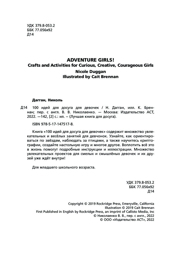 Серия: Лучшая книга для досуга Книга «100 идей для досуга для девочек» содержит множество увлекательных и весёлых занятий для девчонок. Узнайте, как ориентироваться по звёздам, наблюдать за птицами, а также научитесь криптографии, создайте настольную игру и многое другое. Воплотить всё это в жизнь помогут подробные инструкции и иллюстрации. Множество увлекательных проектов для смелых и смышлёных девочек и их друзей уже ждёт внутри! Для младшего школьного возраста. |