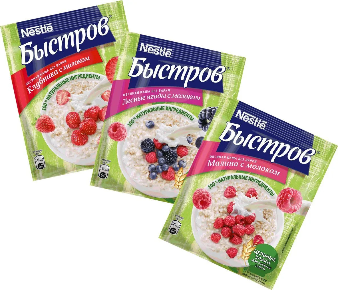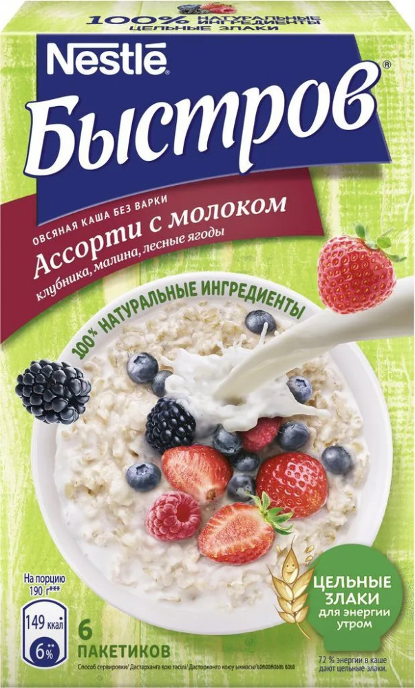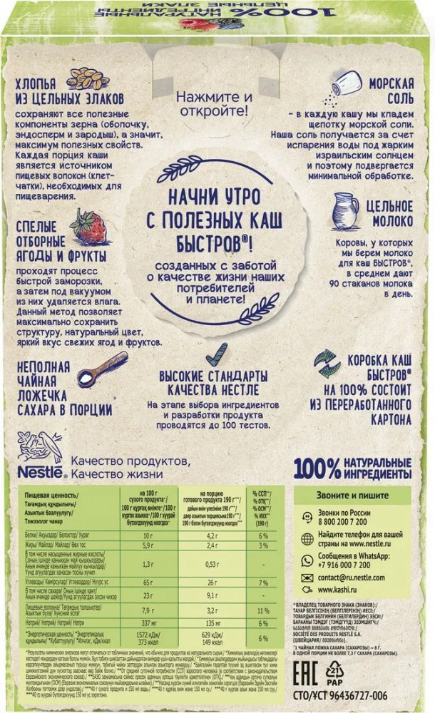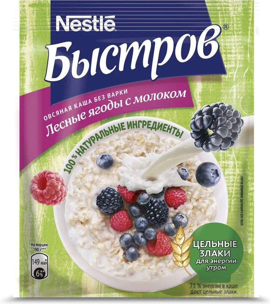 Хлопья овсяные из цельных злаков (74%) (содержат глютен (клейковину)), сахар, сыворотка молочная сухая, сухое цельное молоко (2,3%), лесные ягоды (1,8%) (ежевика, черная смородина, черника, малина), соль морская, натуральный ароматизатор. Продукт может содержать орехи, арахис и кунжут.