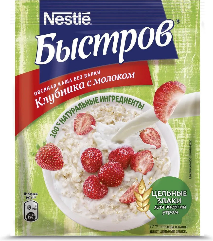 Хлопья овсяные из цельных злаков (72,6%) (содержат глютен (клейковину)), сахар, сыворотка молочная сухая, сухое цельное молоко (2,7%), клубника (1,9%), соль морская, натуральный ароматизатор. Продукт может содержать орехи, арахис и кунжут.