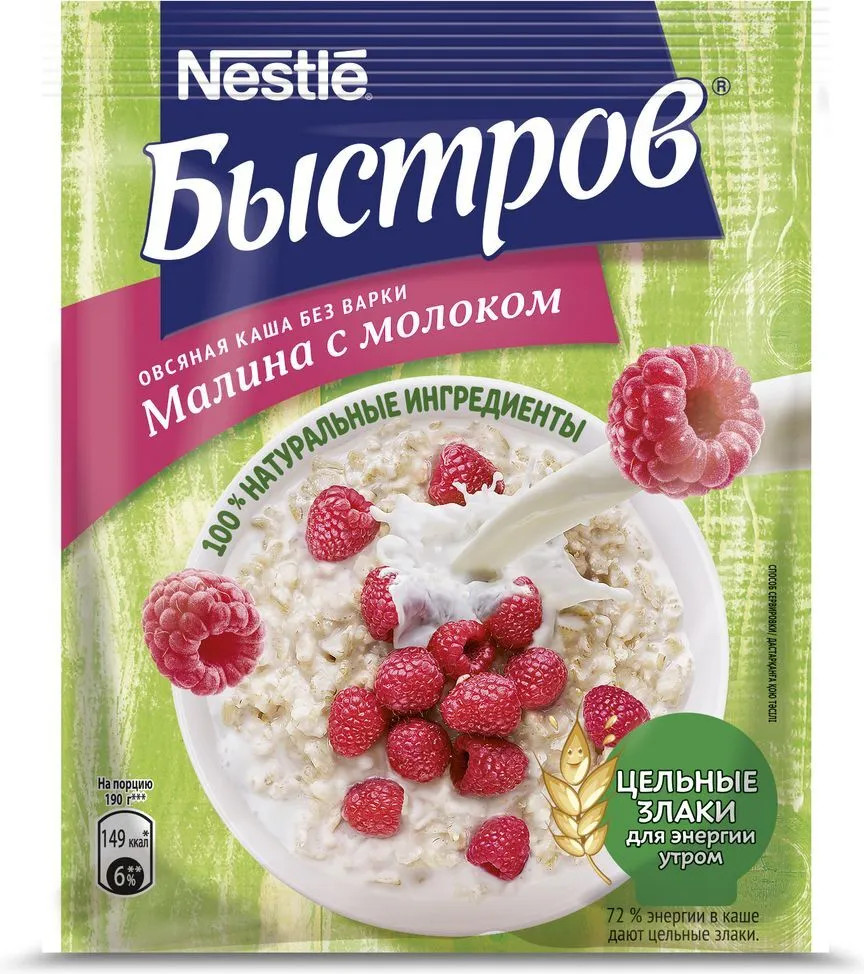 Хлопья овсяные из цельных злаков (72,9%) (содержат глютен (клейковину)), сахар, сыворотка молочная сухая, сухое цельное молоко (3%), малина (1,6%), соль морская, натуральный ароматизатор. Продукт может содержать орехи, арахис и кунжут.