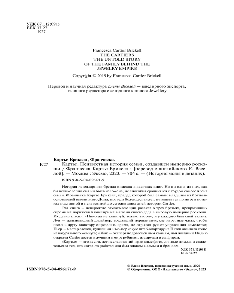 💳 Оплатить за товар можно при получении 🇰🇿 Есть бесплатная доставка по Казахстану от 1 дня 🎁 Копите бонусы с каждой покупки Серия: История моды в деталях Франческа Картье Брикелл — прямой потомок Картье. Ее прапрапрадед основал компанию Cartier в 1847 году, а покойный дед, Жан-Жак Картье, был последним представителем семьи, который управлял и владел филиалом легендарного ювелирного Дома. Оставив карьеру в сфере финансов, Франческа посвятила 10 лет жизни независимому исследованию истории династии. |