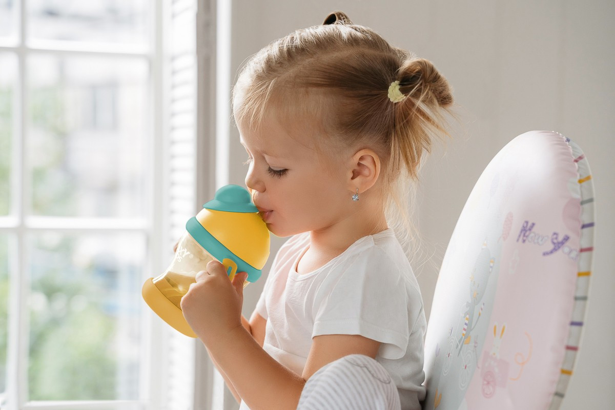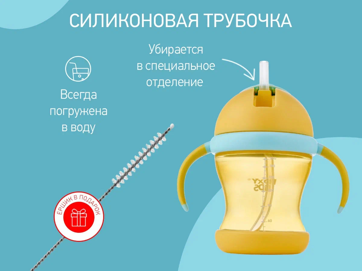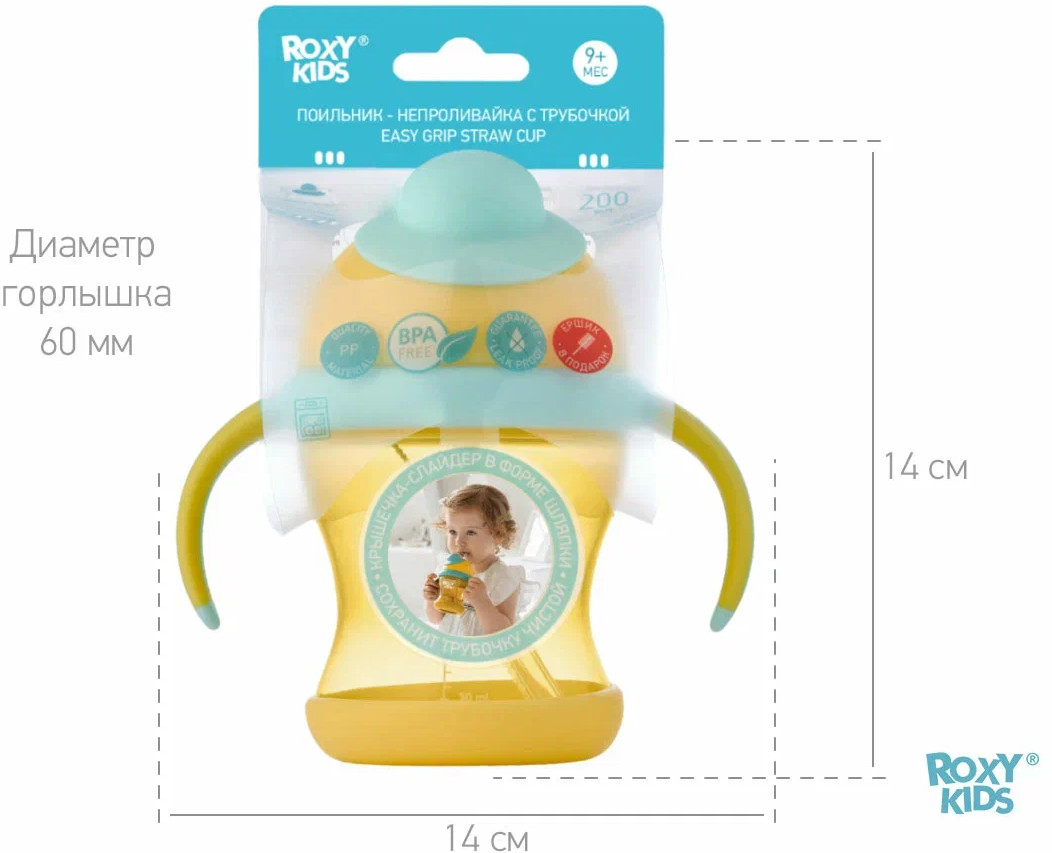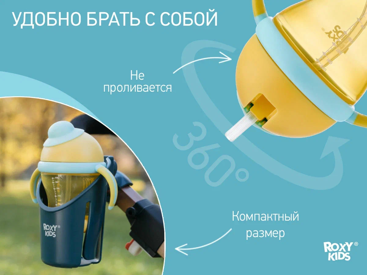 Тренировочный поильник-непроливайка поможет малышу научиться пить самостоятельно и привыкнуть к использованию обычной чашки. Изогнутая нижняя часть трубочки всегда погружена в жидкость вне зависимости от положения поильника, поэтому малыш будет оставаться в естественном положении во время питья. Трубочка сделана из мягкого силикона и не повреждает десны и зубки ребенка. Защелкивающаяся крышка-слайдер в форме шляпки предотвращает протекание воды во время переноски и помогает сохранять трубочку в чистоте. Прочные прорезиненные ручки разработаны специально для малышей и имеют удобную для захвата форму. Детская бутылочка с ручками подходит для использования дома, на прогулках и в путешествиях. Яркий дизайн привлечет внимание малыша и сделает процесс кормления веселым и беззаботным! Поильник легко разбирается и моется. В комплект входит ёршик для силиконового носика. Аксессуары, игрушки и товары для детей от бренда ROXY-KIDS станут прекрасным подарком девочкам и мальчикам на любой праздник!