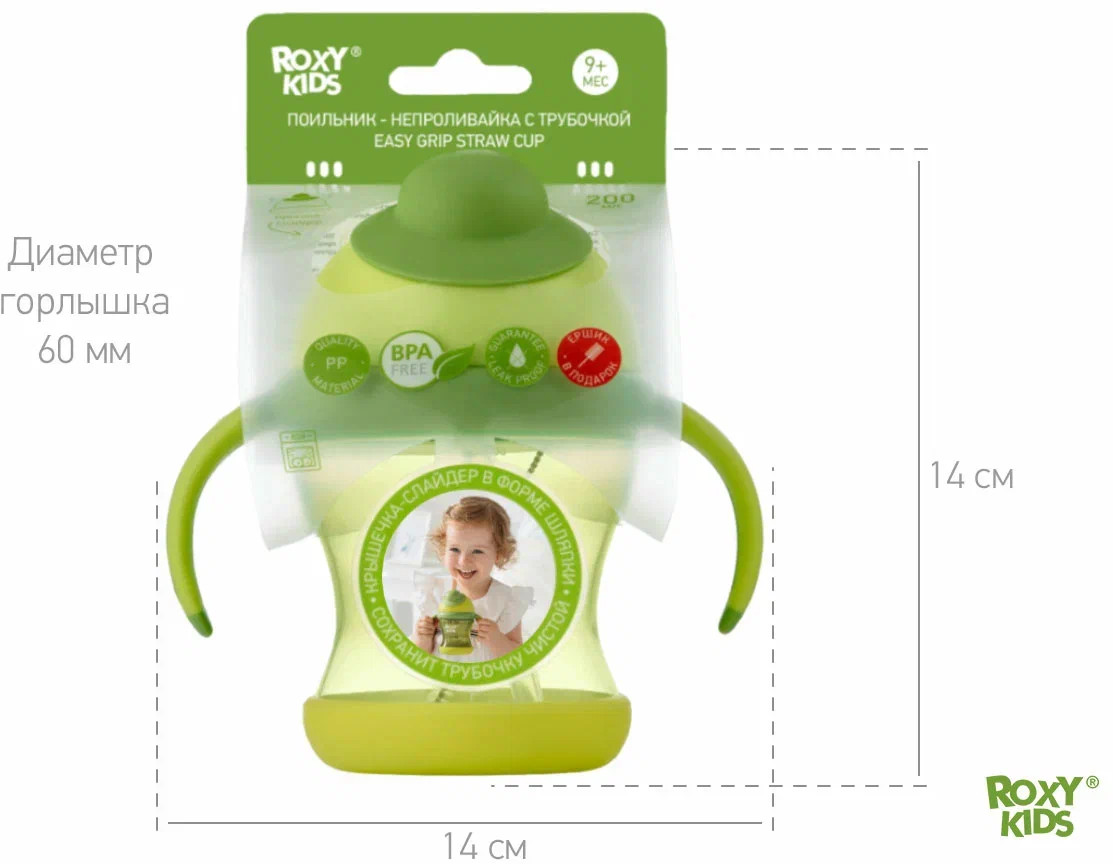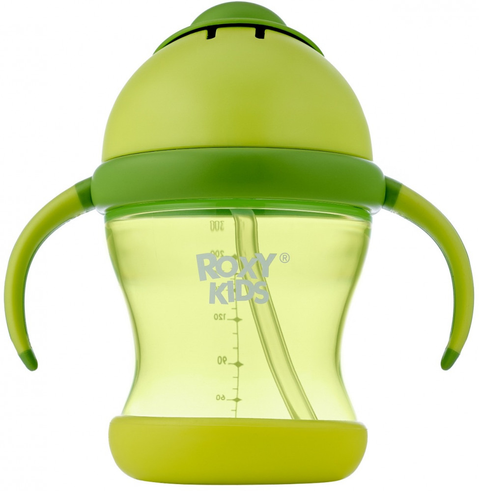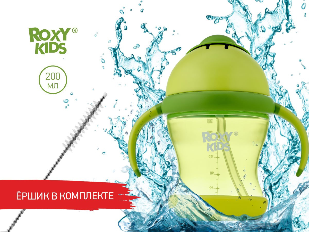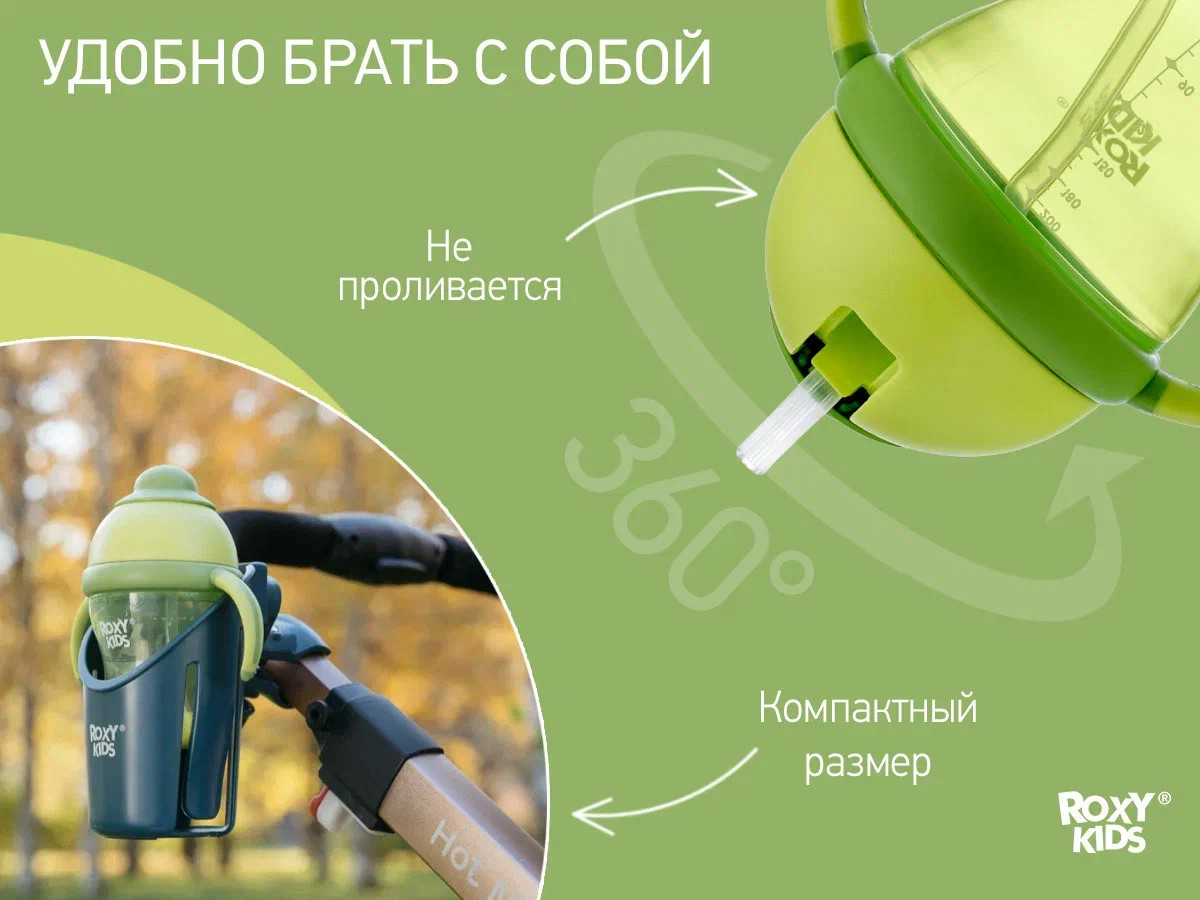 Тренировочный поильник-непроливайка поможет малышу научиться пить самостоятельно и привыкнуть к использованию обычной чашки. Изогнутая нижняя часть трубочки всегда погружена в жидкость вне зависимости от положения поильника, поэтому малыш будет оставаться в естественном положении во время питья. Трубочка сделана из мягкого силикона и не повреждает десны и зубки ребенка. Защелкивающаяся крышка-слайдер в форме шляпки предотвращает протекание воды во время переноски и помогает сохранять трубочку в чистоте. Прочные прорезиненные ручки разработаны специально для малышей и имеют удобную для захвата форму. Детская бутылочка с ручками подходит для использования дома, на прогулках и в путешествиях. Яркий дизайн привлечет внимание малыша и сделает процесс кормления веселым и беззаботным! Поильник легко разбирается и моется. В комплект входит ёршик для силиконового носика. Аксессуары, игрушки и товары для детей от бренда ROXY-KIDS станут прекрасным подарком девочкам и мальчикам на любой праздник!