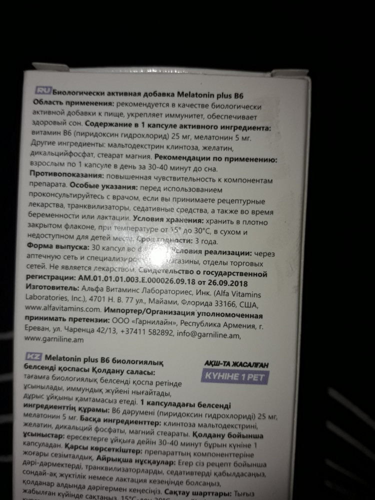 Есть проблемы со сном из-за разных смен на работе(то утром, то в ночь),тяжело засыпать после ночной. Сон был очень крепким, но я с большим трудом проснулась. Мне было плохо после первого приема капсулы, "мурашки" по коже лица, головы, онемение руки, вялость, сонное состояние около 20 часов уже после пробуждения. Дозировка огромная. В норме 2мг витамина В6 должна быть суточная норма для человека, в данном препарате 25мг. Мелатонина рекомендуется принимать 3мг,но не более 6мг в сутки, в данном препарате 5мг. Принимать данное средство более не буду. Надеюсь, я буду единственной, на кого это средство так повлияло.