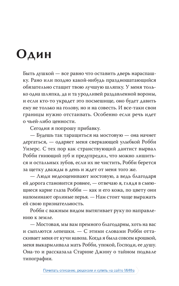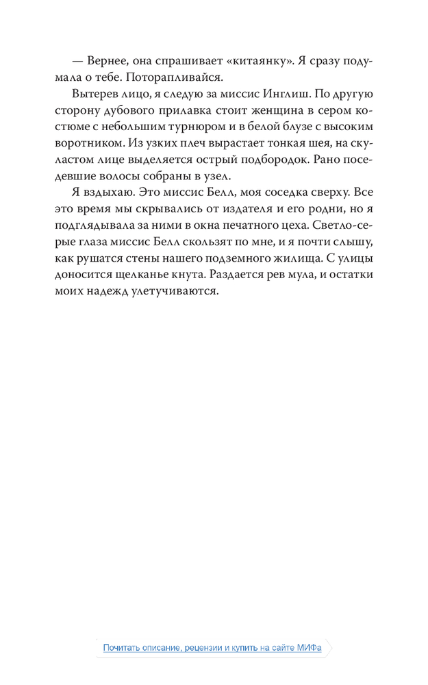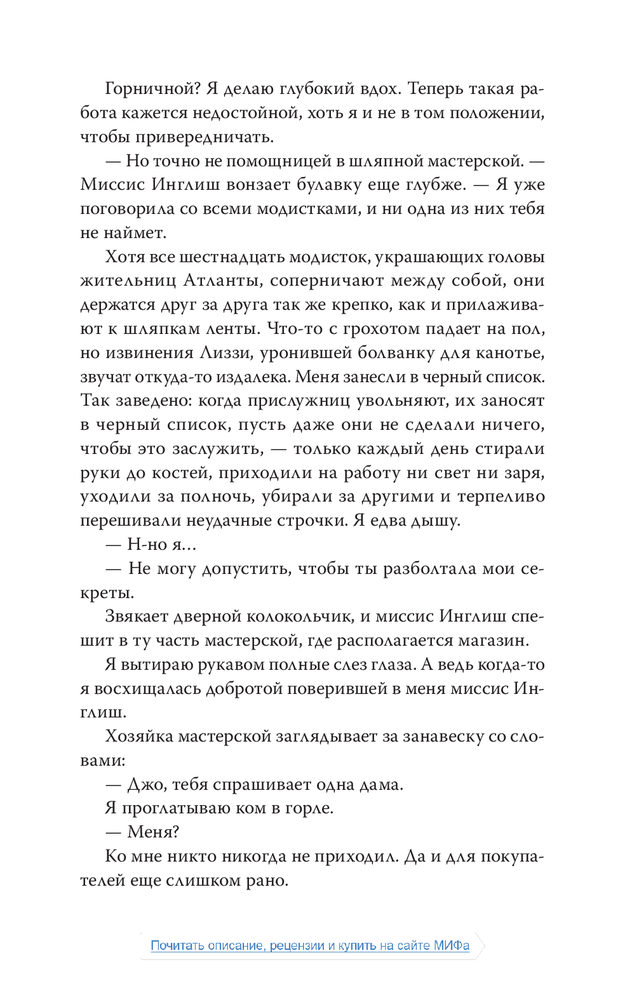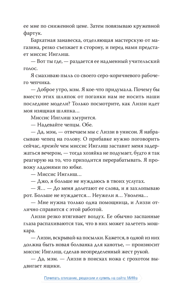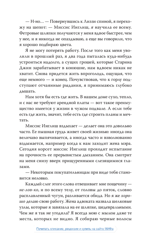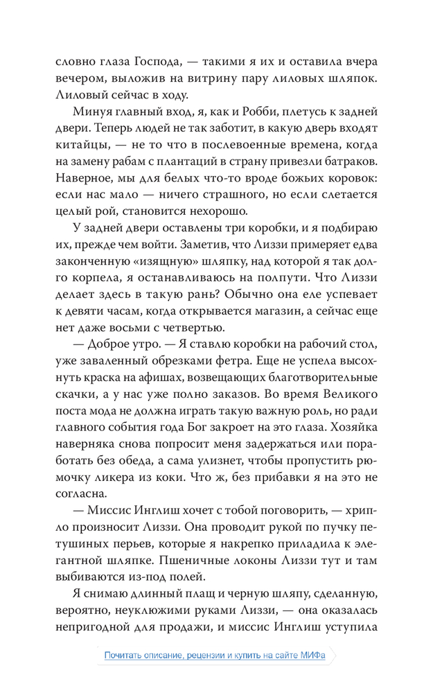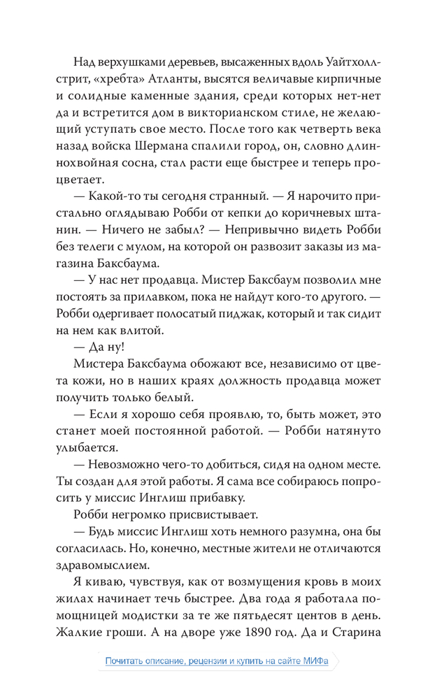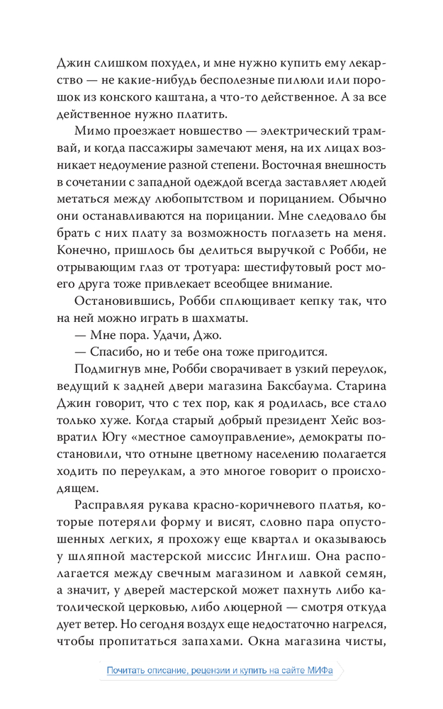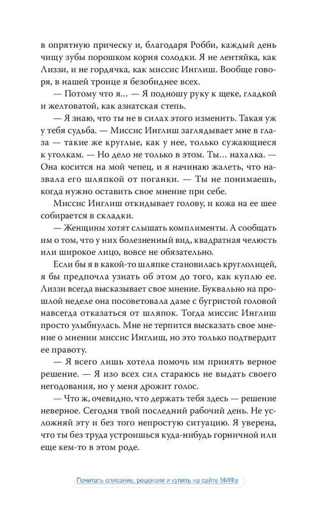 «Мужчины при виде меня либо хмурятся, либо заливаются смехом, и я не могу сказать, что из этого хуже. Один из них, задрав нос, равнодушно смотрит сквозь меня. Они, по всей видимости, не чувствуют во мне конкурента, но, возможно, оно и к лучшему. Обычно самые страшные угрозы приходят оттуда, откуда мы их совсем не ждем».