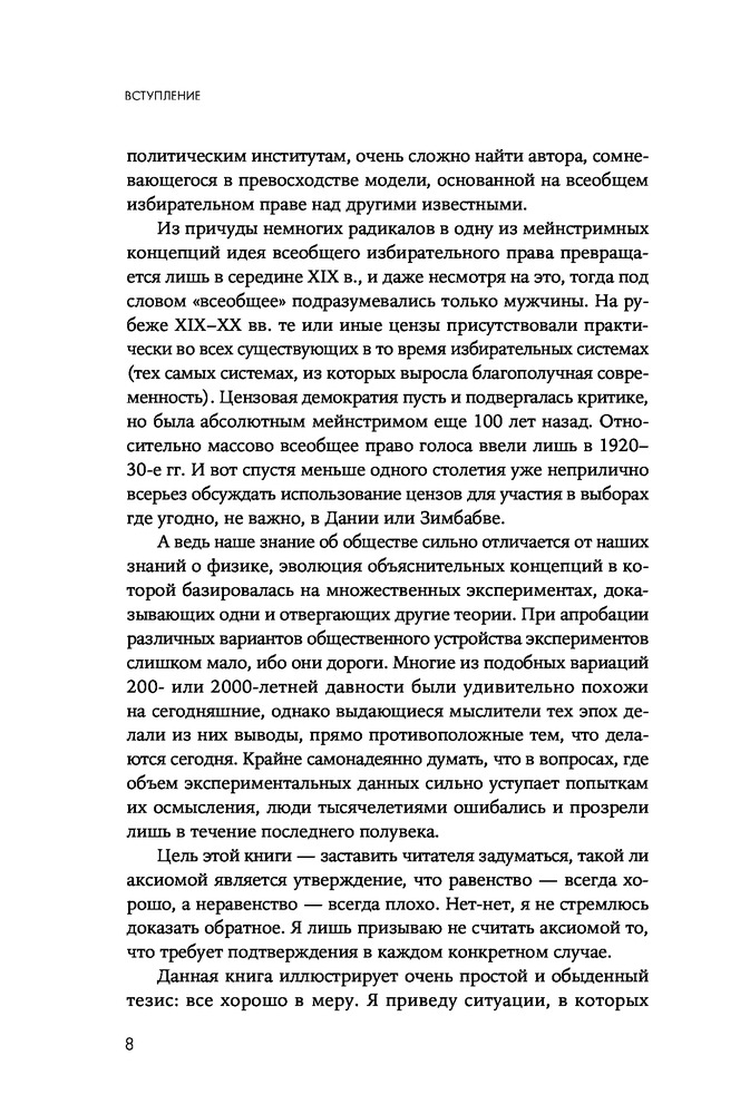 Социальное неравенство. Альтернативный взглядВ данный момент этот товар отсутствует в продаже. Возможно, у нас найдется аналогичный или похожий товар здесь. Цель этой книги — заставить читателя задуматься, такой ли аксиомой является утверждение, что равенство — всегда хорошо, а неравенство — всегда плохо. Автор рассматривает ситуации, в которых стремление достичь излишнего равенства ведёт к снижению общего благосостояния. Он также предлагает под непривычным углом взглянуть на некоторые аспекты экономического и политического неравенства и вопросы дискриминации отдельных этнических и социальных групп. |