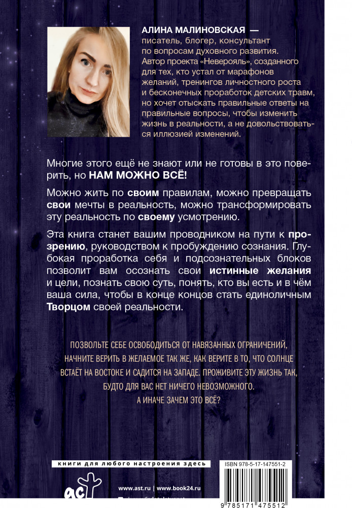 Серия: Психотренинг Алина Малиновская — писатель, блогер, консультант по вопросам духовного развития. Автор проекта «Неверояль», созданного для тех, кто устал от марафонов желаний, тренингов личностного роста и бесконечных проработок детских травм, но хочет отыскать правильные ответы на правильные вопросы, чтобы изменить свою жизнь, а не довольствоваться иллюзией изменений.