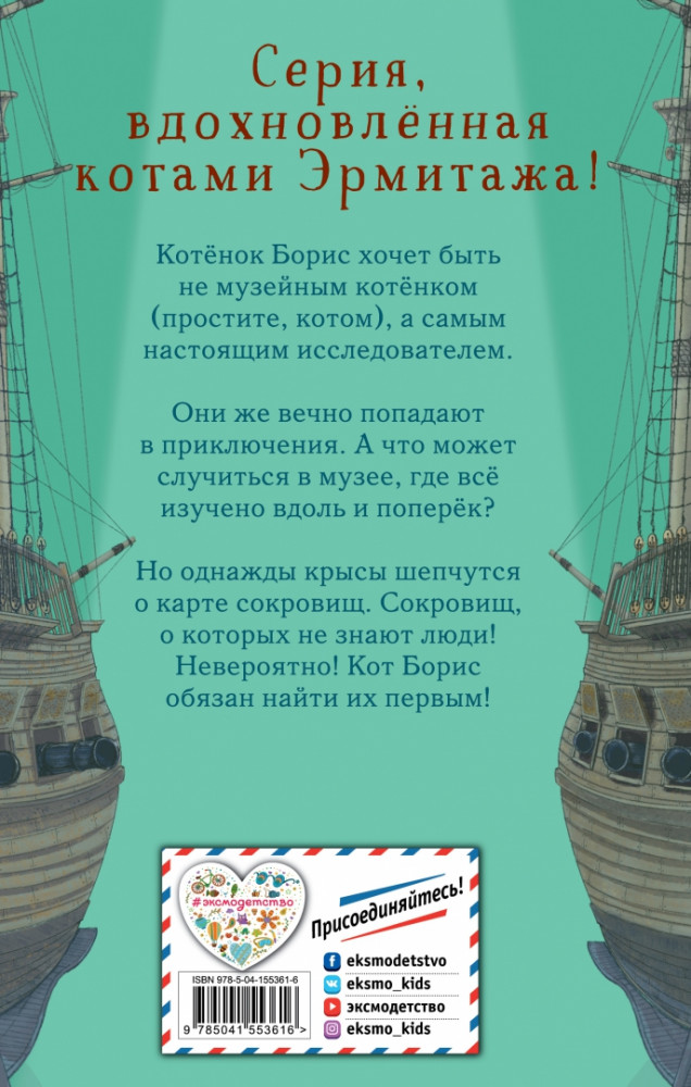 💳 Оплатить за товар можно при получении 🇰🇿 Есть бесплатная доставка по Казахстану 🎁 Копите бонусы с каждой покупки Серия: Холли Вебб. Котята в музее Котёнок Борис стремится к приключениям. Даже взрослые коты подробно рассказывают о дежурстве в ночном музее, только если произошло что-нибудь необычное. Без приключений жить так скучно! Поэтому стоило Борису услышать, как крысы обсуждают карту сокровищ, он тут же встрепенулся. Сокровища! Настоящие сокровища! В музее, где котята исследовали всё вдоль и поперёк! Борис просто обязан найти их первым! |