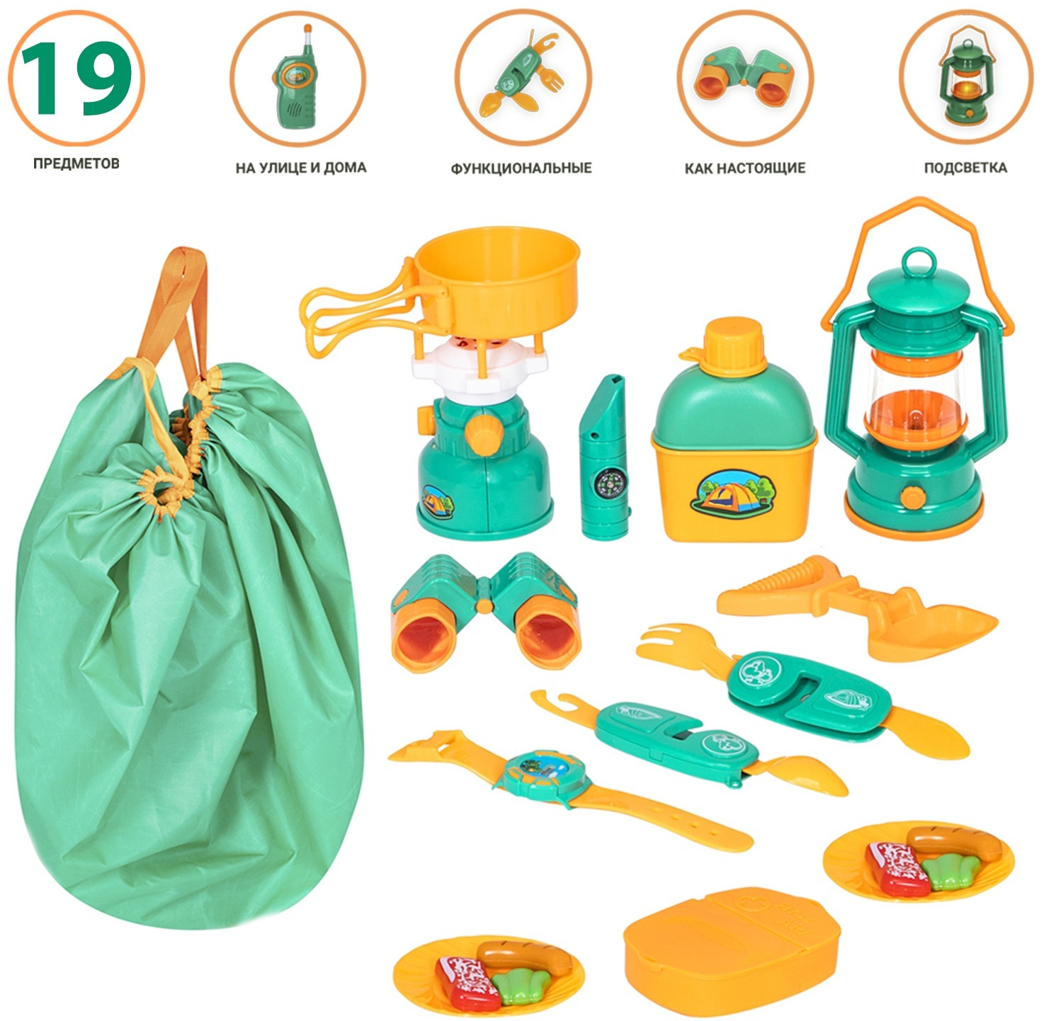 💳 Оплатить за товар можно при получении 🇰🇿 Есть бесплатная доставка по Казахстану 🎁 Копите бонусы с каждой покупки Серия: Набор туриста Игровой набор туриста идеальный выбор для игры в походы и пикники. Его можно использовать круглый год: летом для игр на природе, а в другое время для игр в детской комнате. Теперь у маленького путешественника будут свои собственные туристические предметы. Все самое нужное для пикника и туристического похода в одном наборе. Все предметы набора функциональные, максимально повторяют реальные предметы. Лампа, примус работают от 2-х батареек АА (в комплект не входят). Мультиприбор работают от батареек AG3 (входят в комплект). Фляга, аптечка, сковорода, лопата, бинокль, складной ножик, часы тарелки в точности повторяют оригиналы. Бинокль удобно использовать при обзоре местности. Коврик превращается в удобный мешок для переноски всех предметов на пикник. Игрушка изготовлена из прочного и безопасного пластика, устойчивого к механическому воздействию. Туристический набор выполнен в классических цветах, что понравиться юному туристу. |