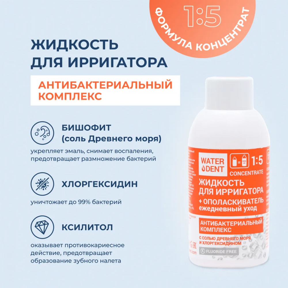 Способ применения: разбавить жидкость в пропорции 1:5, залить в резервуар ирригатора или использовать как ополаскиватель полости рта. Прополоскать рот в течение 15 секунд и сплюнуть. Использовать не реже двух раз в день после еды и после чистки зубов. Для ежедневного использования.