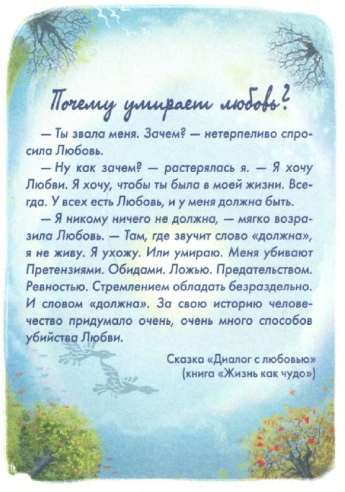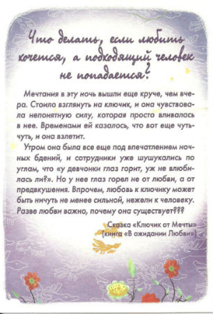 24 шага к Счастливой Любви. Набор психологических картВ данный момент этот товар отсутствует в продаже. Возможно, у нас найдется аналогичный или похожий товар здесь. Серия: Мудрые сказки для взрослых Мы мечтаем о Счастливой Любви. И все мы ее достойны! Но нам, как в сказке, приходится пройти много разных тропинок, решить трудные задачки, вынести много испытаний, прежде чем мы придем к своей Любви. А потом нужно еще уметь принять этот Бесценный Дар и бережно его хранить. |