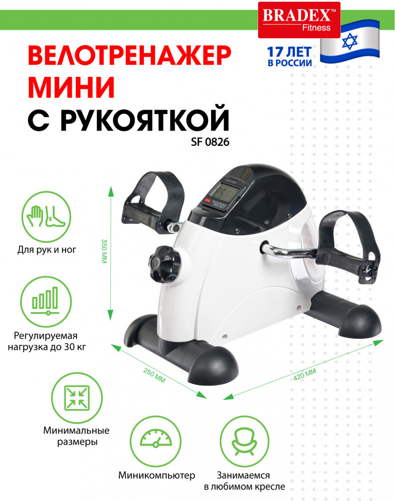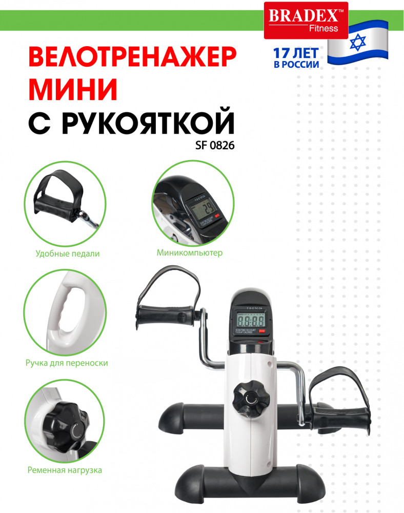 В данный момент этот товар отсутствует в продаже. Возможно, у нас найдется аналогичный или похожий товар здесь. Мини велотренажёр Bradex SF 0826 — один из самых компактных и простых домашних тренажеров. В отличие от обычных велотренажёров у него нет стойки с сиденьем, поэтому его можно установить там, где вам удобно, расположиться относительного него под любым углом и на любой высоте. Можно тренироваться, даже сидя в любимом кресле перед телевизором или прямо на рабочем месте.