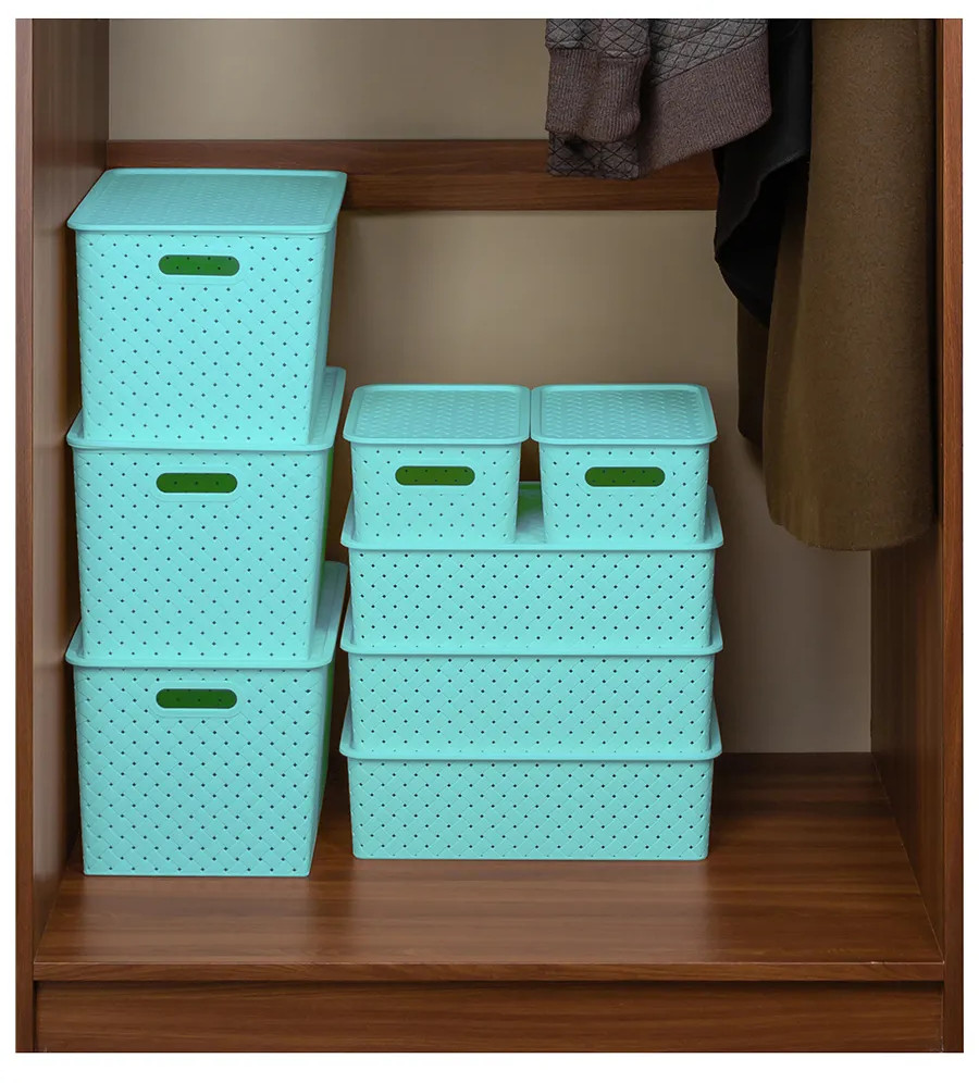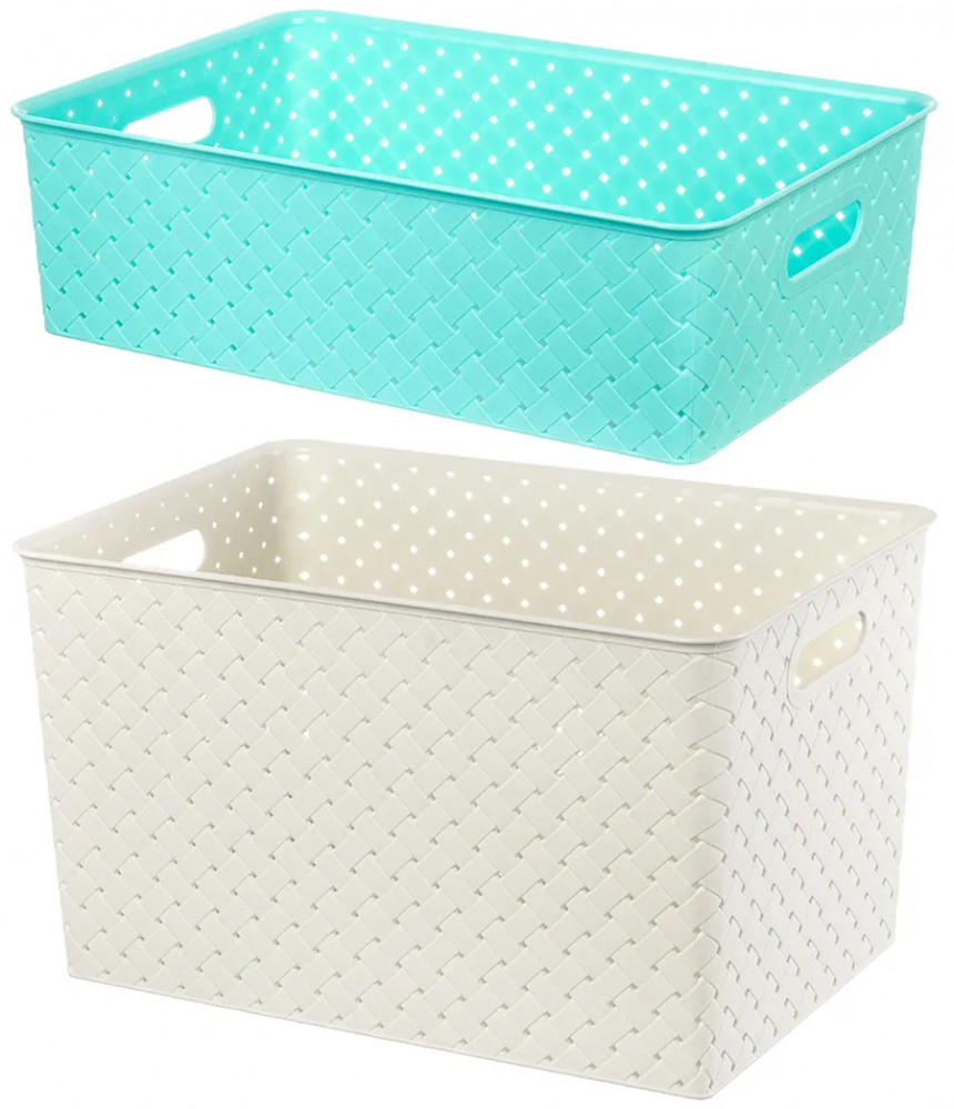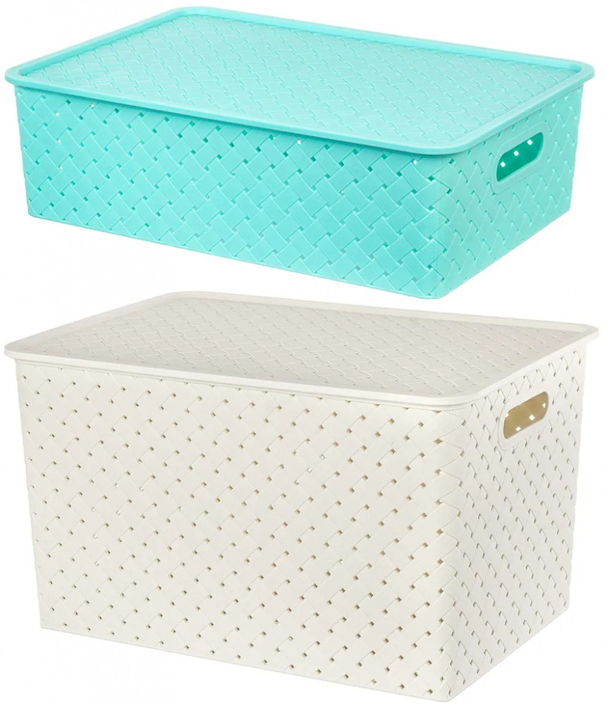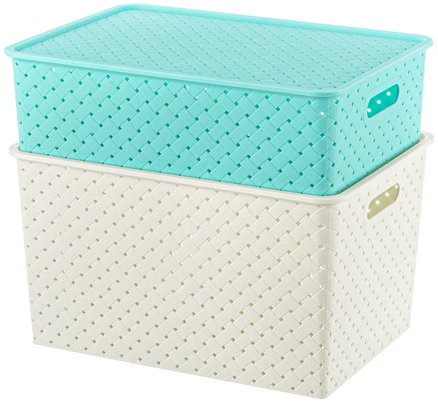 Набор из 2-х корзин с ручками и крышками (14 литров, 7,5 литра) можно разместить на кухне, в ванной, прихожей, офисе, гараже или в шкафу. Большие коробки подойдут для бытовой химии, игрушек, одежды (для шапок, перчаток, белья, носков), а маленькие корзинки — для канцелярии, косметики, украшений, рукоделия (для пряжи, вязания) и других мелочей. Контейнеры 7,5 литра подойдут для документов и бумаги А4. Корзины выполнены из пищевого полипропилена и украшены декоративными рельефными узорами с отверстиями для вентиляции. Полностью безопасны и подходят для продуктов. Используйте их для овощей, как хлебницы или как фруктовые корзинки. Можно использовать как подарочные боксы: собрать наборы для мужчин и женщин, девушек и парней, мальчиков и девочек. Пластиковые корзины из серии «Береста» привлекательно выглядят и помогут создать систему для хранения вещей в едином стиле или гардеробную систему.