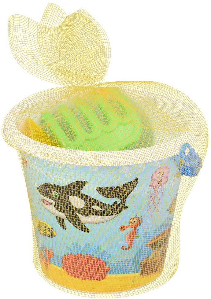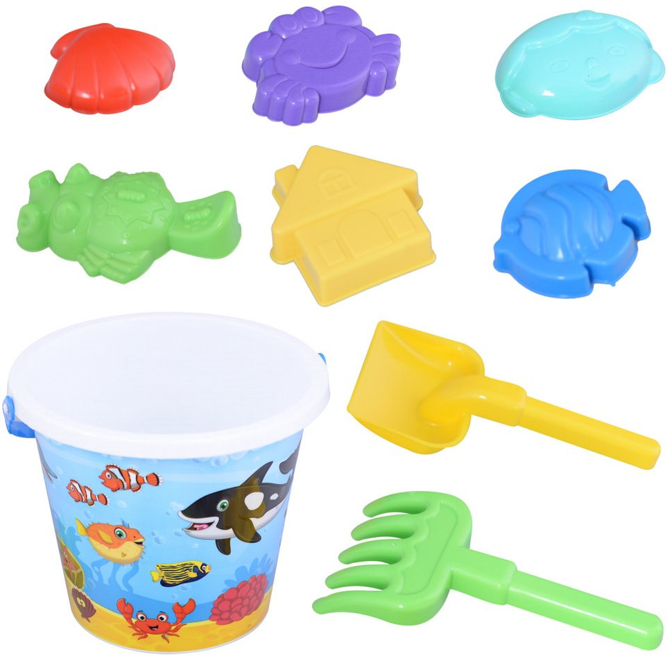 В набор входит ведёрко, лопатка, грабли и формы для лепки. С помощью специальных форм ребенок сможет создать фигуры на анималистическую тематику. Все изделия выполнены из безвредного пластика высокого качества. Легкий вес и небольшой размер изделий позволят малышу без труда переносить воду и песок, лепить замки и многое другое. Весь набор легко промывается под проточной водой и не выгорает на солнце.
