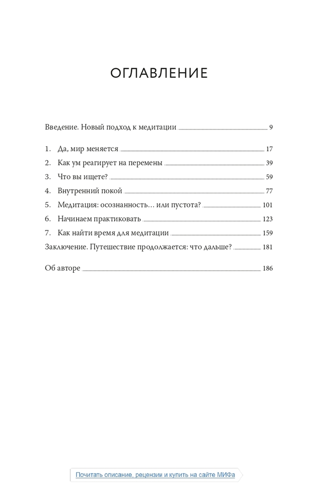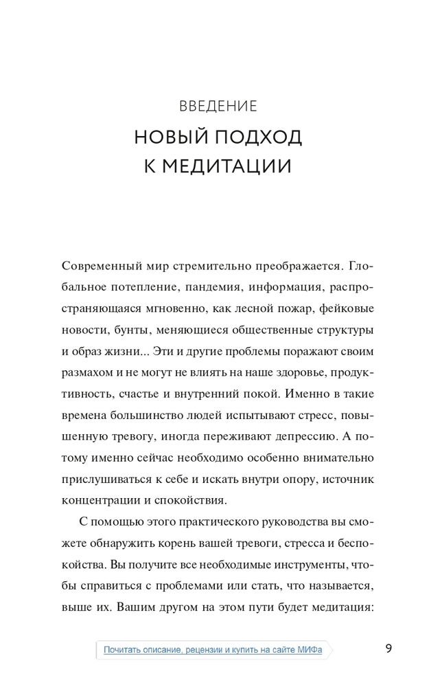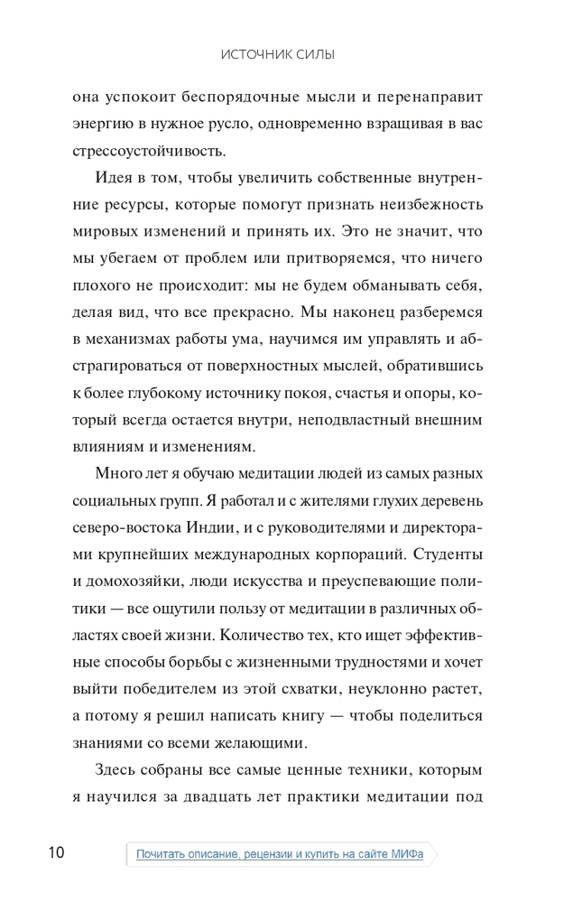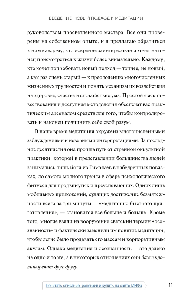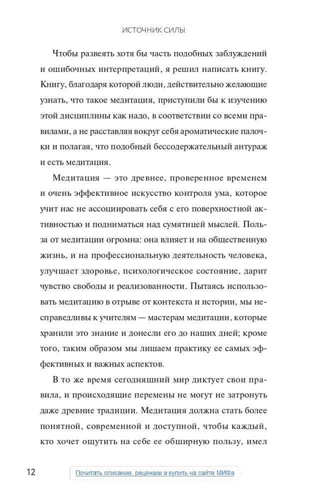 «Это древнее, проверенное временем и эффективное искусство контроля ума, которое учит нас не ассоциировать себя с его поверхностной активностью и подниматься над сумятицей мыслей. Польза от медитации огромна: она влияет и на общественную жизнь, и на профессиональную деятельность человека, улучшает здоровье, психологическое состояние, дарит чувство свободы и реализованности.».