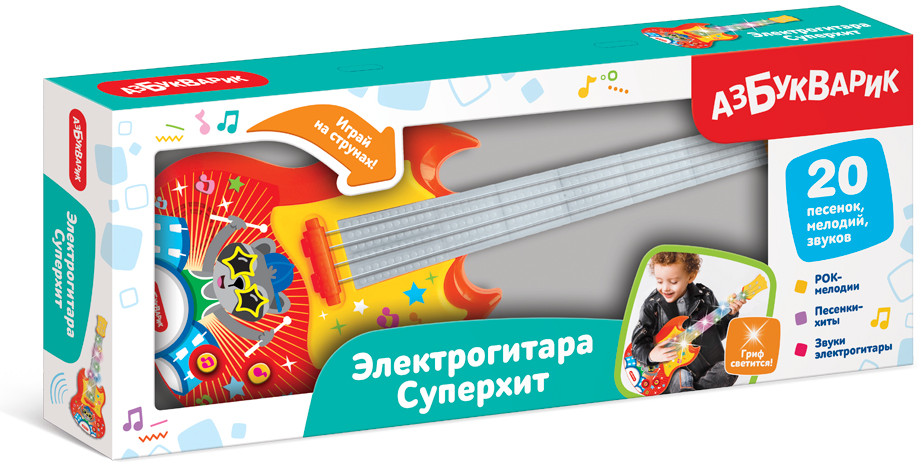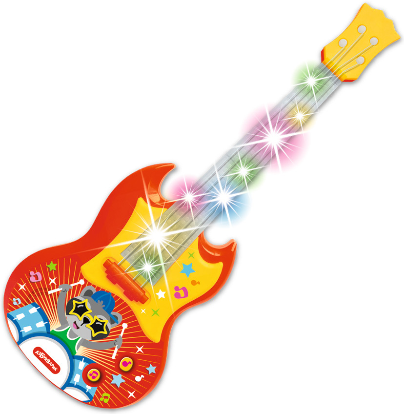 Детская гитара в стиле РОК! У нее крутой современный дизайн, настоящие струны, на которых можно сыграть, гриф с разноцветной подсветкой. Но главное — на музыкальных кнопочках записаны 16 самых модных детских хитов и рок-мелодий в оригинальной аранжировке («Бум-Бум», «Арам зам зам», «Калинка», «Песенка про кузнечика», «Кукарача» и др.).