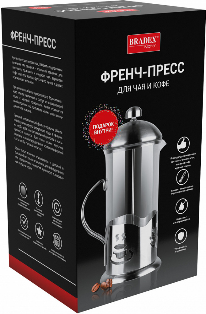 Bradex Френч-прессВ данный момент этот товар отсутствует в продаже. Возможно, у нас найдется аналогичный или похожий товар здесь. Френч-пресс для чая, кофе с матовой полировкой, 600 мл и подарочной мерной ложкой — практичный заварник для листового, травяного, ягодного чая и зернового кофе, выполненный из термостойкого боросиликатного стекла. Прочная колба с прозрачными стенками отличается устойчивостью к царапинам, не мутнеет и не окрашивается, поэтому ее можно мыть в посудомоечной машине. Крепкий корпус френч-пресса сделан из нержавеющей стали. Металлический фильтр отлично подходит для приготовления чая и кофе крупного помола, а также фруктового пунша и других прохладительных напитков. Он надежно удерживает чаинки и кофейную гущу на дне колбы. Для этого нужно лишь опустить поршень, и заварка уйдет вниз, оставляя в верхней части колбы готовый напиток. Чай, заваренный во френч-прессе, получается ароматным, с оптимальной крепостью и насыщенностью, а черный кофе — с более мягким вкусом. Френч-пресс незаменим для повседневного или праздничного чаепития, красивого заваривания и подачи кофе в офисе, дома, на даче. |