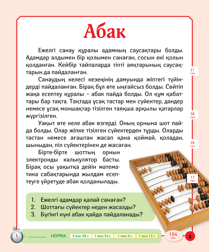 💳 Оплатить за товар можно при получении 🇰🇿 Есть бесплатная доставка по Казахстану от 1 дня 🎁 Копите бонусы с каждой покупки Серия: Минуттық-әңгімелер Кітап кіші мектеп жасындағы балаларға оқу мен оқу қабілеттерін игеруге арналған. Кітапта оқу жылдамдығын арттыратын және оқу техникасына арналған әртүрлі ойындар пайдаланылған. |