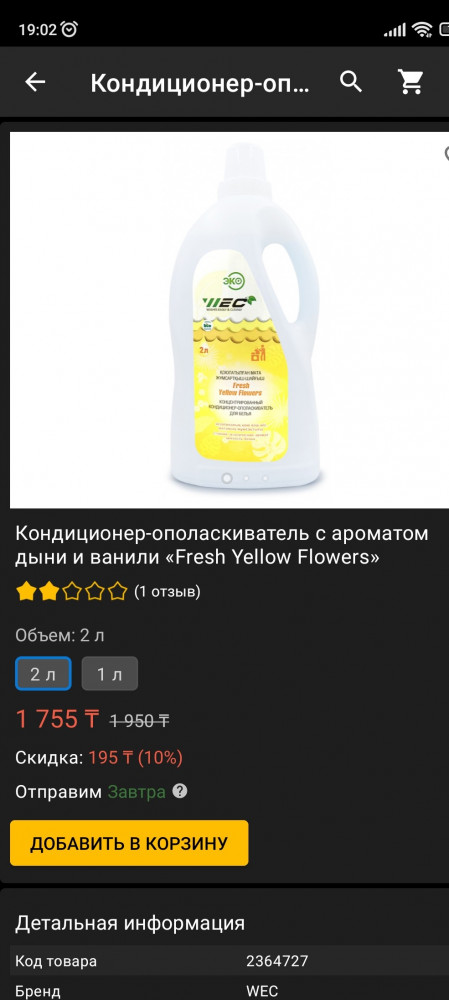 Кондиционер функцию свою выполняет. Снизила оценку за некорректное описание аромата, дыни и ванили нет, резкий тяжёлый сладкий химический запах. Указано в описании "дыня и ваниль", а название "Свежесть жёлтых цветов". Производитель - гений маркетинга. Разведу с кондиционером без запаха, может так не будет "сшибать" свежесть цветов.