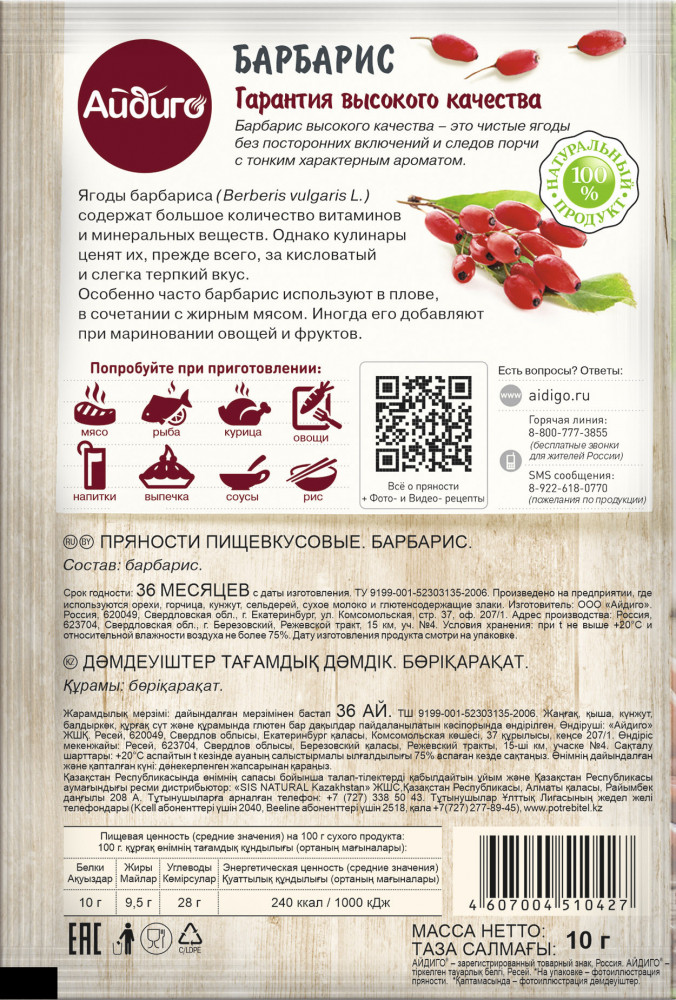 💳 Оплатить за товар можно при получении 🇰🇿 Есть бесплатная доставка по Казахстану от 1 дня 🎁 Копите бонусы с каждой покупки Серия: Классические пряности В ягодах барбариса в большом количестве содержатся витамины и минеральные вещества, но кулинары ценят их, прежде всего, за кисловатый, слегка терпкий вкус. Особенно часто барбарис используют при приготовлении плова, иногда добавляют при мариновании овощей и фруктов. Идеален в сочетании с жирным мясом, т.к. облегчает пищеварение. В некоторых блюдах ягоды барбариса вполне могут заменить лимон для придания кисловатого оттенка. Добавлять барбарис можно и в чай, квас, компоты, в том числе и в алкогольные. |