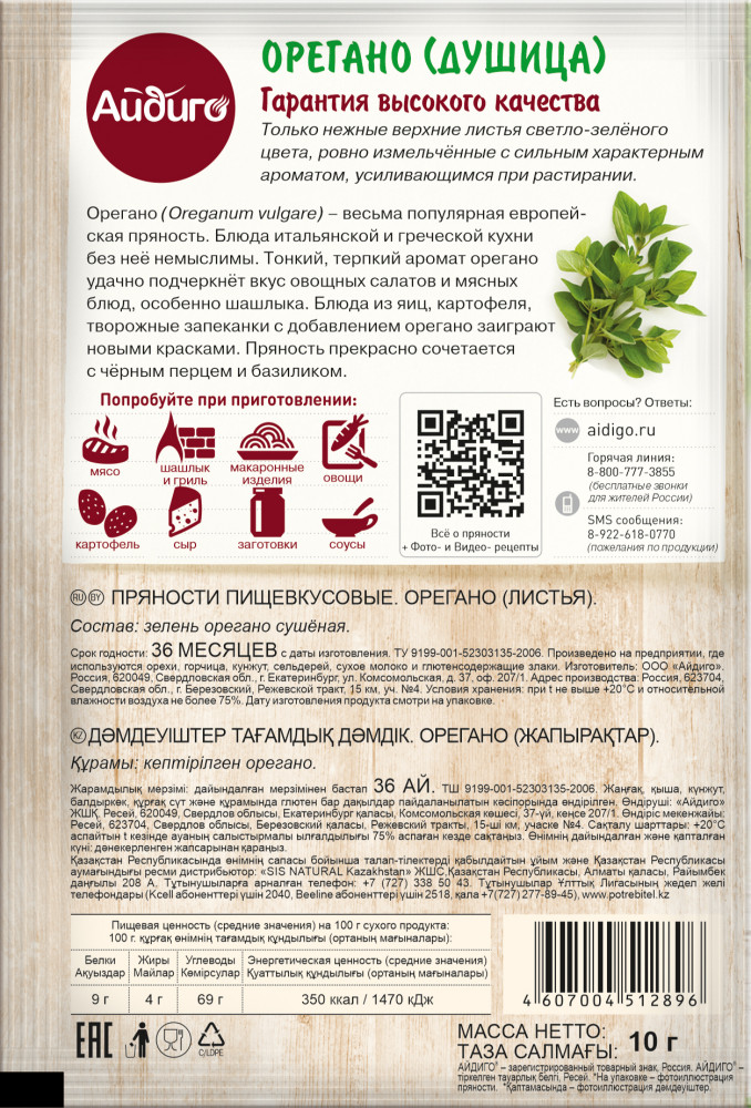 💳 Оплатить за товар можно при получении 🇰🇿 Есть бесплатная доставка по Казахстану от 1 дня 🎁 Копите бонусы с каждой покупки Серия: Пряные травы Орегано — это весьма популярная европейская пряность. Блюда итальянской и греческой кухни без ее добавления просто немыслимы. Чаще всего эту пряность использовали для ароматизации напитков (чай, пиво, вино, квас) или в качестве добавки в консервы. Тонкий терпкий вкус орегано удачно подчеркивает вкус овощных салатов и мясных блюд, особенно шашлыка. А горячие овощные блюда с добавлением орегано заиграют новыми красками. |