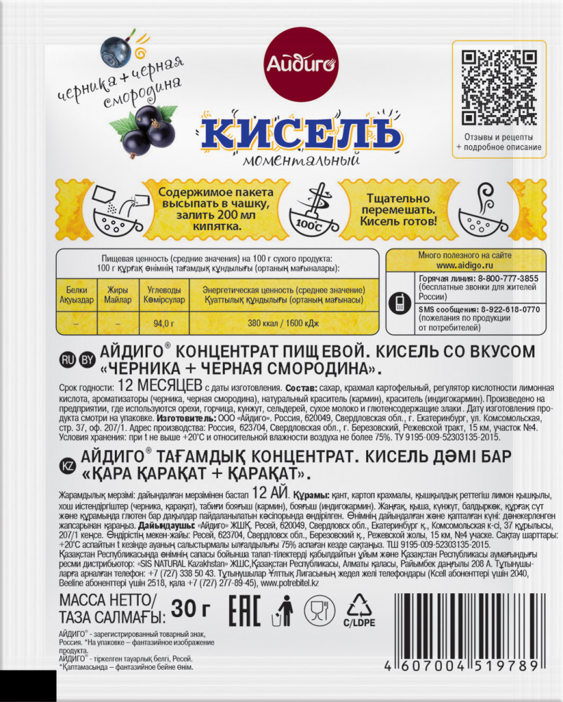 Айдиго Кисель моментальный со вкусом черной смородины и черники