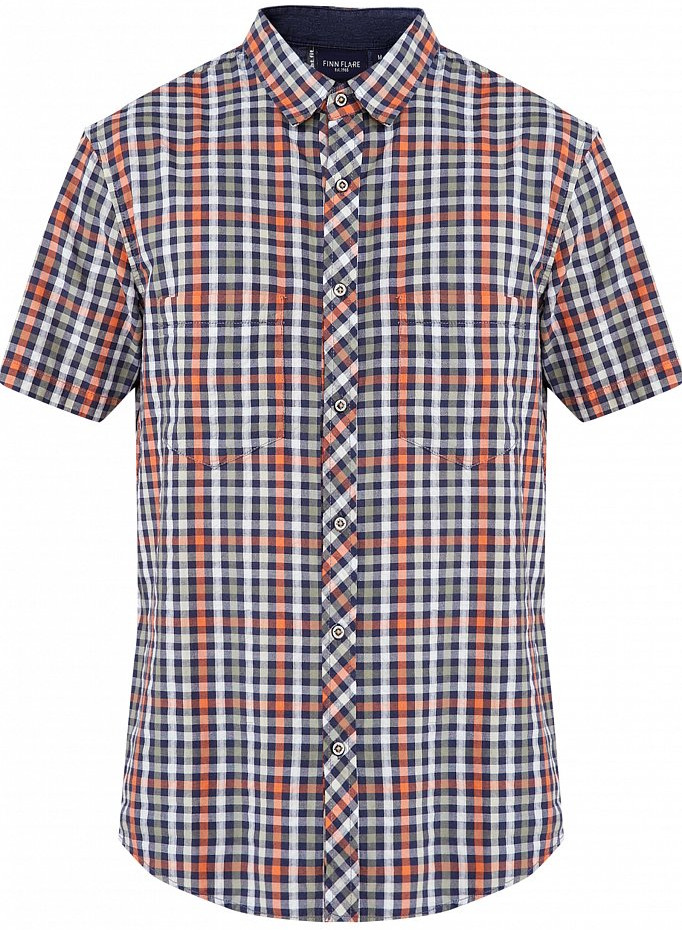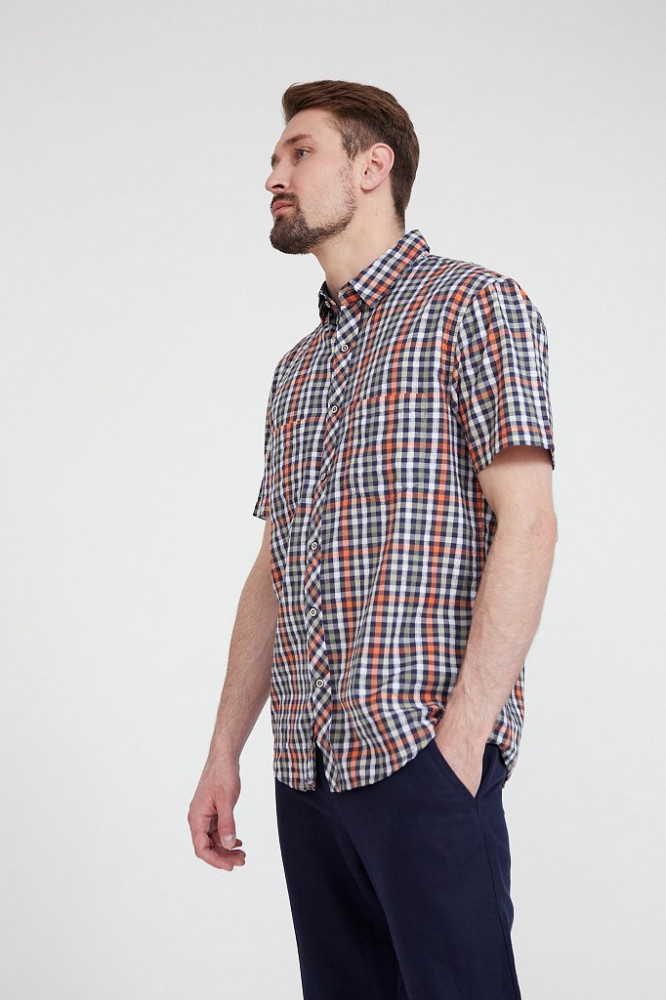 Мужская рубашка из 100% хлопка. По переду обработана застежка на планке на пуговицы и петли. Воротник рубашечного типа, отложной на стойке. Рукава короткие.