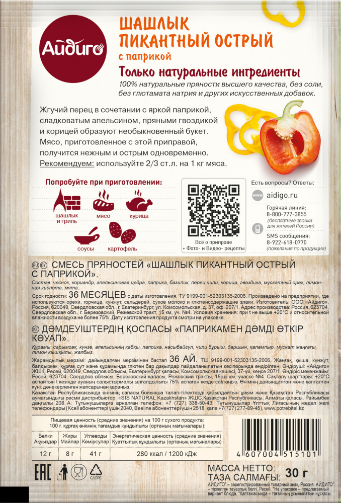 Айдиго Приправа «Шашлык пикантный, острый с паприкой»В данный момент этот товар отсутствует в продаже. Возможно, у нас найдется аналогичный или похожий товар здесь. Серия: Приправы Жгучий перец в сочетании со сладковатым апельсином, пряными гвоздикой и корицей образуют необыкновенный букет. Мясо, приготовленное с этой приправой, получается нежным и острым одновременно. |
