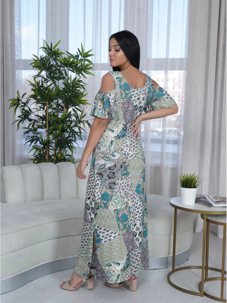 Отличное платье. Материал холодок, слегка тянется, на рост 165 отлично смотрится с сандалями на танкетке.