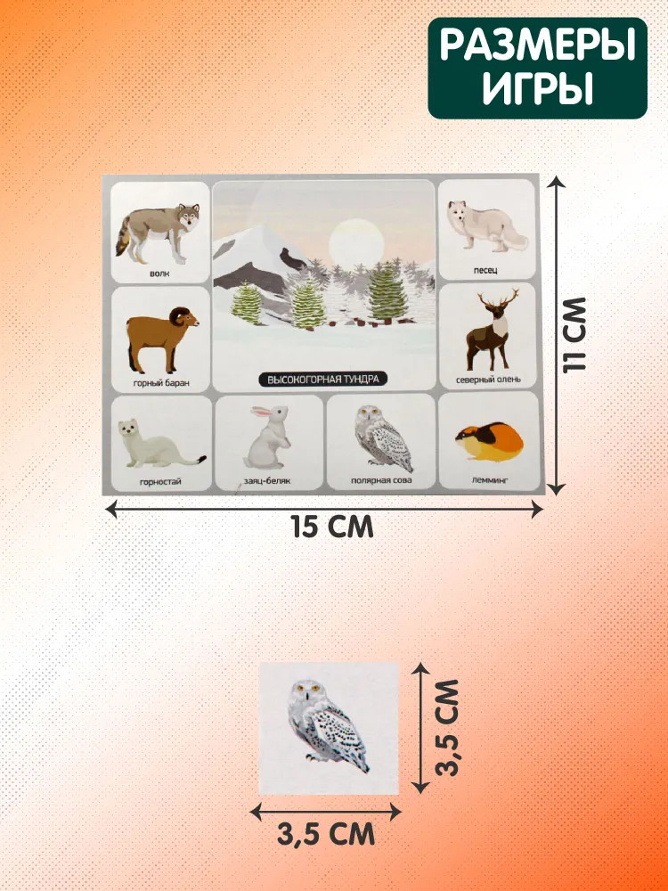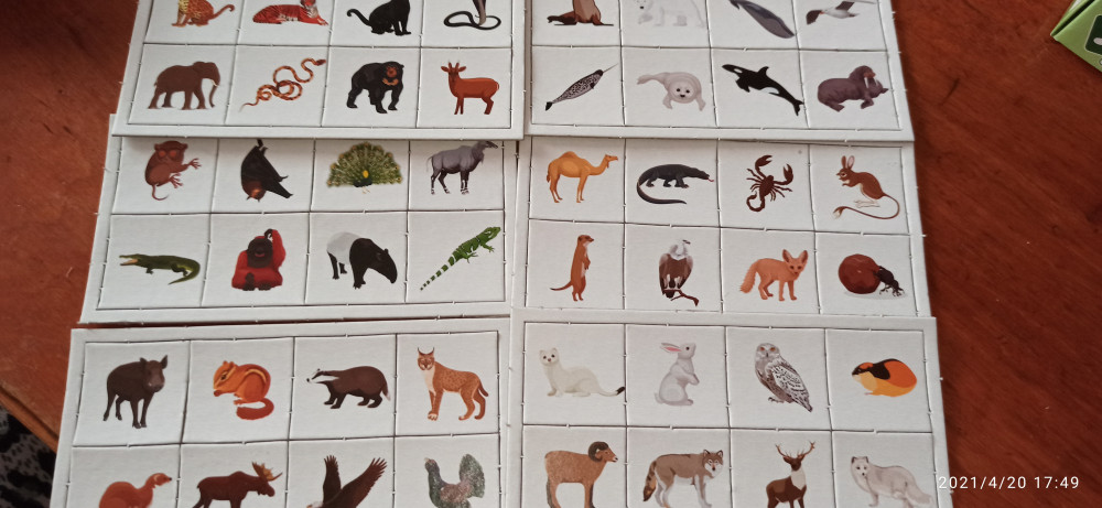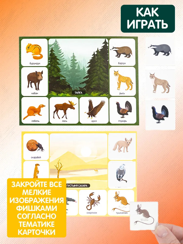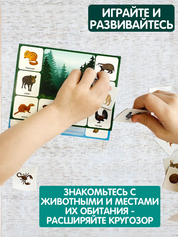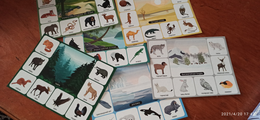 Каждая большая карточка посвящена определенной природной зоне — смешанный лес, степь, тайга тундра, пустыня, арктика. Малые карточки разделены на тематические группы животных и птиц по видам обитания в природных зонах.