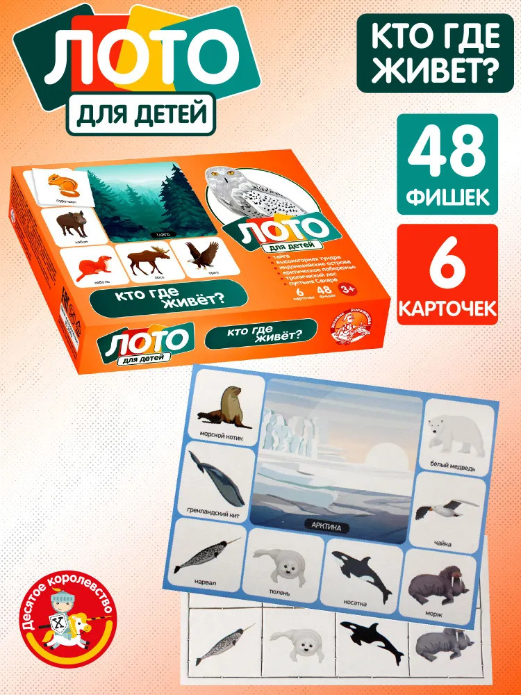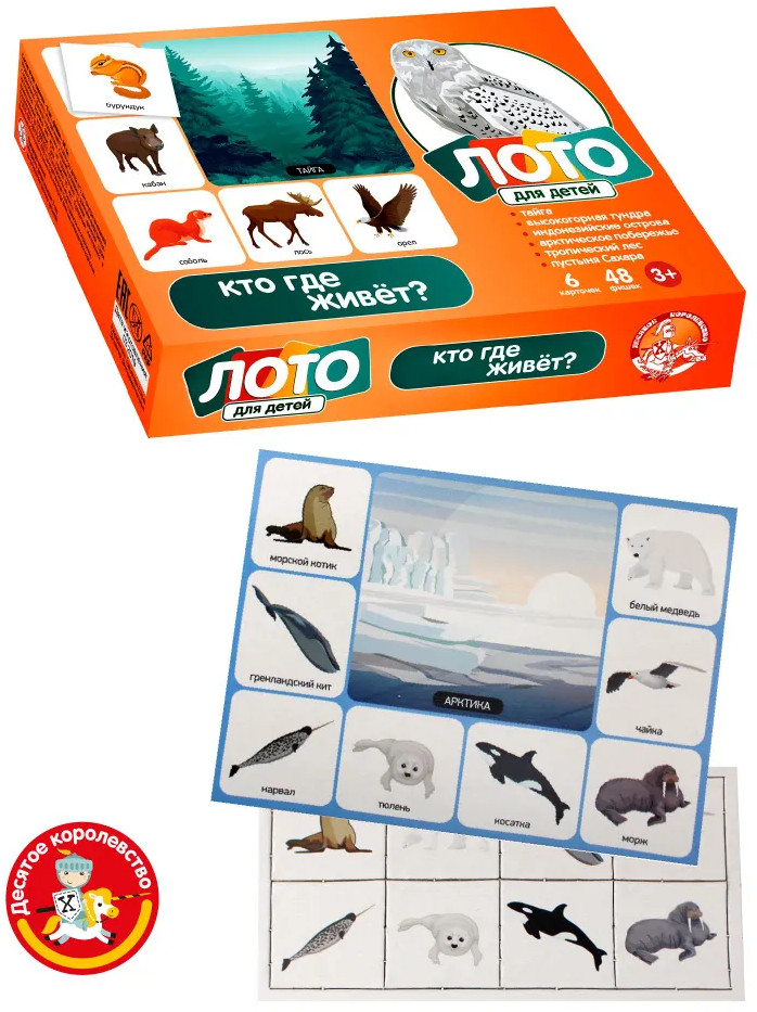 Картонное малое развивающее детское лото «Кто где живет?» поможет ребенку лучше узнать окружающий его мир, познакомиться с животными и птицами, и в каких природных зонах в нашей стране они обитают.