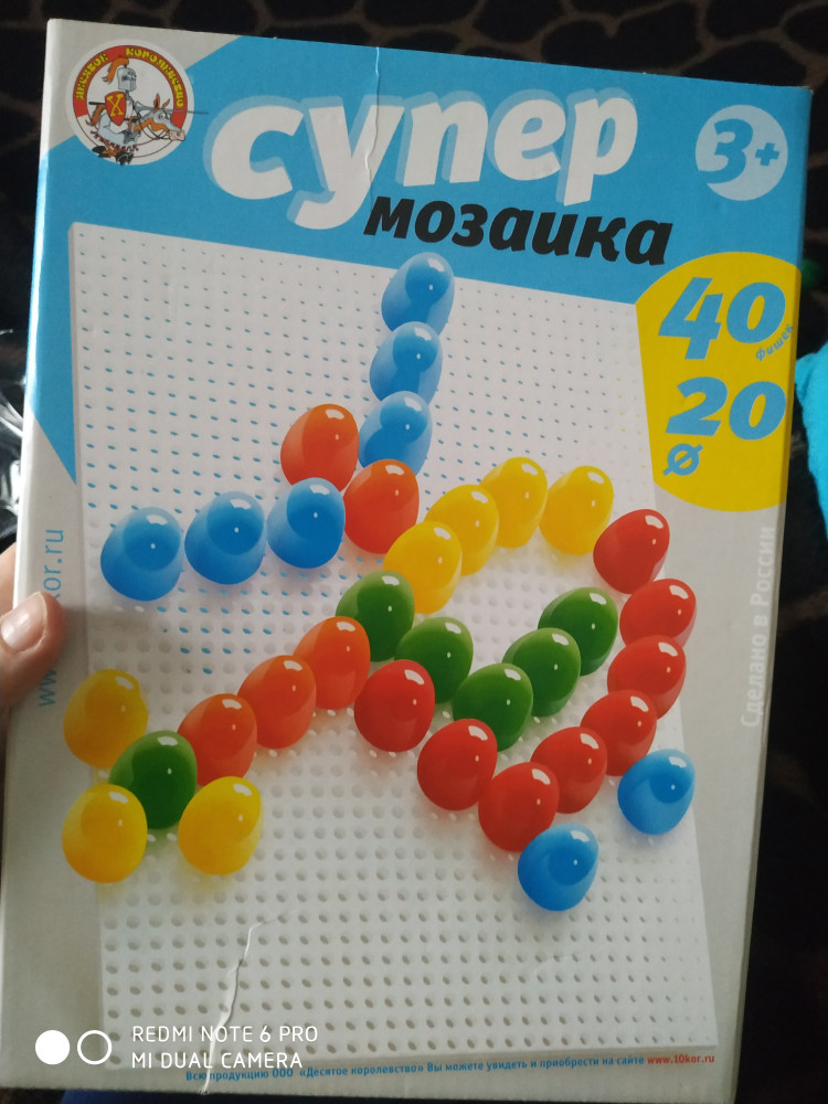 отличная мозаика. крупные детальки пяти цветов. некоторые очень плотно входят в отверстия. может со временем это изменится. запаха нет. цвета яркие. главное,моему сынуле,1,2 г,очень нравится.