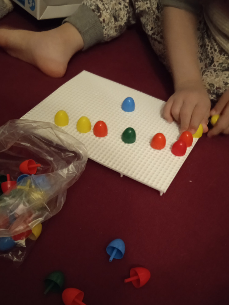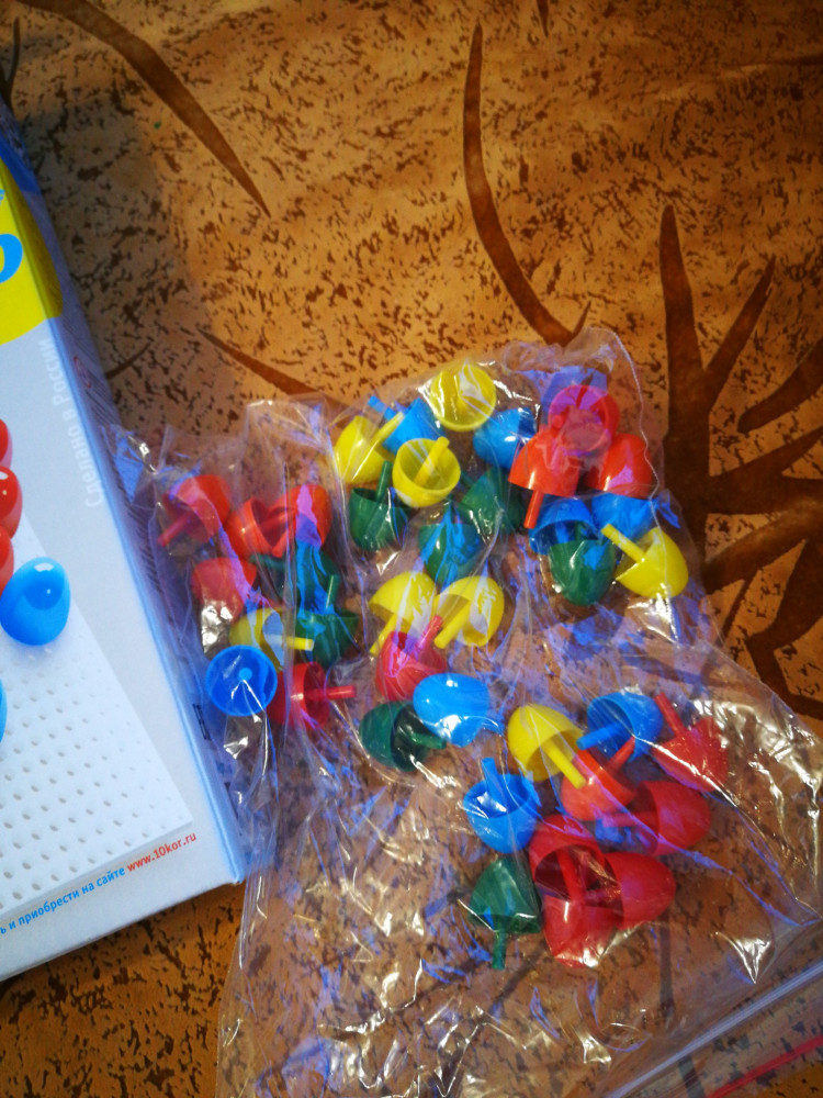 Неплохая мозаика, но плохо обработаны края у некоторых фишек (легко обрезать кусачками), и толщина ножек разная, из-за чего некоторые достаточно туго входят в отверстия на поле. Даже взрослому приходится приложить усилие. Ребёнку постарше подойдут, а совсем малышам не рекомендовала бы. Мы их приспособили как материал для сортировки, пересыпания и самодельных мозаик. Подрастём - используем по назначению)