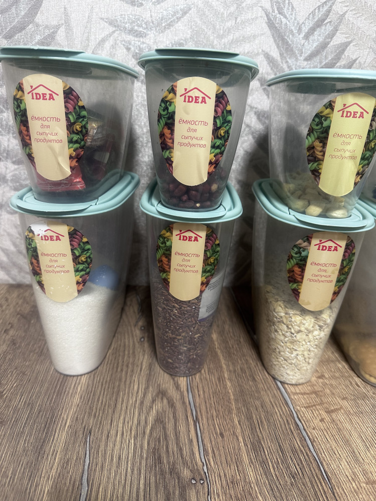 Классные баночки! Аж 4 штуки сразу купила !! Для круп купила! Очень понравились. Пластик шикарный, гладенький и ничем не пахнет. Качество супер.