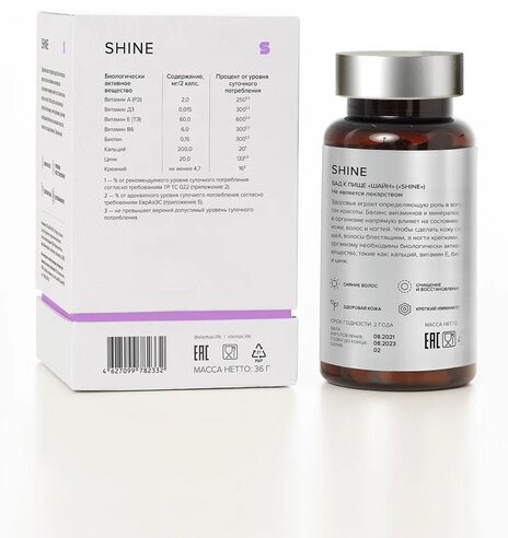 В данный момент этот товар отсутствует в продаже. Возможно, у нас найдется аналогичный или похожий товар здесь. Shine— красота кожи, волос и ногтей. Комплекс Shine содержит набор питательных веществ, которые помогут сделать кожу сияющей, волосы блестящими, а ногти крепкими. Альфа токоферол в сочетании с биотином благоприятно влияет на здоровье эпидермиса. Витамины А и D3 увлажняют кожу и оздоравливают структуру волос, а кальций и цинк способствует очищению кожи и укреплению ногтей.
