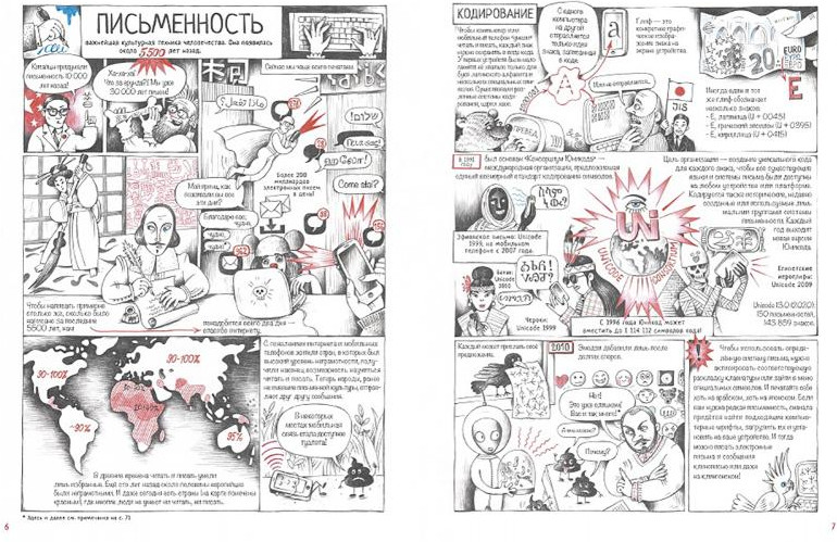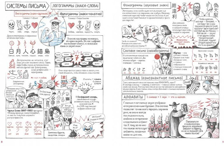 Тут описывается более ста различных видов письма с древних времён до цифровой эпохи, начиная с клинописи и заканчивая эмодзи и вымышленными языками. Формат комикса наглядно демонстрирует особенности различных алфавитов, консонантного и слогового письма, логографического письма и так далее. В схемах и картах показана не только история происхождения и развития той или иной письменности, но и как она устроена. Читатель сможет сопоставить разные системы и подумать, какая кажется ему наиболее логичной и простой. Вот Оксфордский университет, например, объявил лучшей системой письма современности корейское письмо хангыль! |