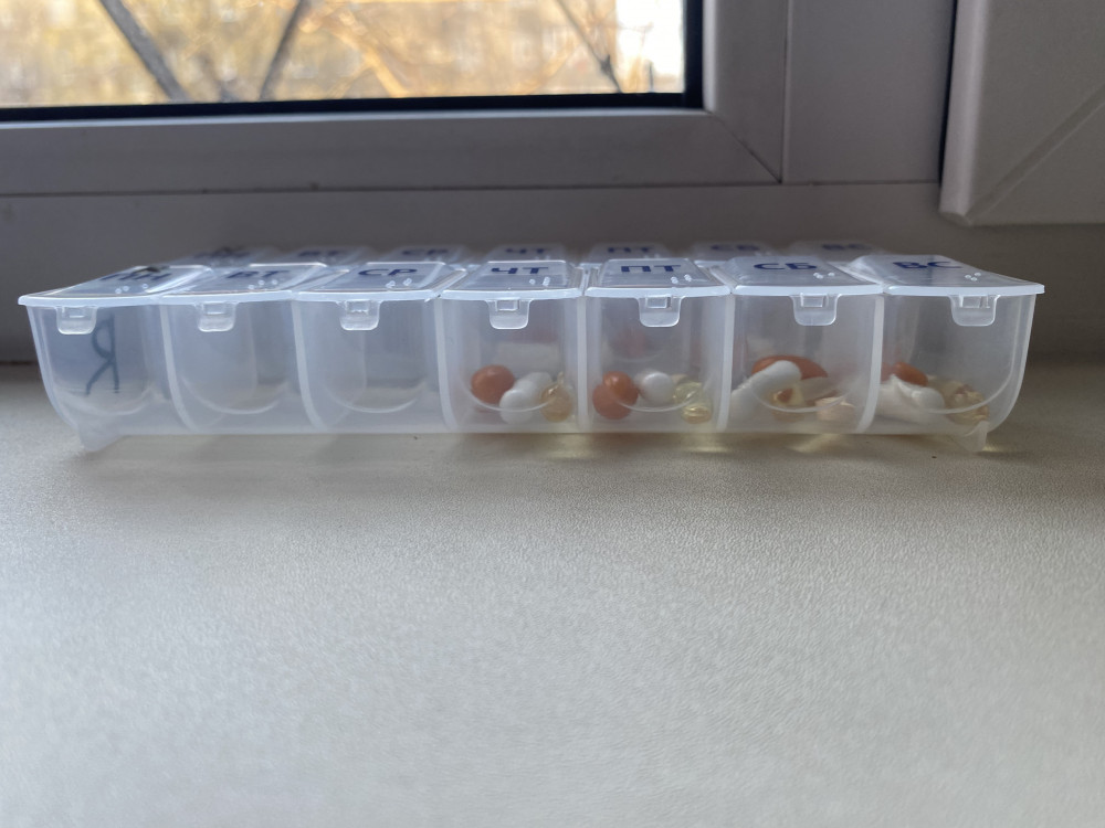 Компактный, по размеру не очень большой, но таблеток поместится много. Крышки плотно прилегают