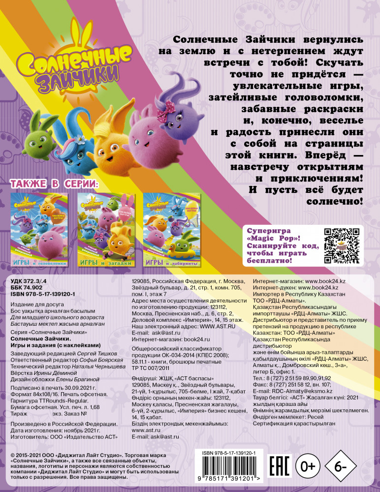 💳 Оплатить за товар можно при получении 🇰🇿 Есть бесплатная доставка по Казахстану от 1 дня 🎁 Копите бонусы с каждой покупки Серия: Солнечные Зайчики Солнечные Зайчики вернулись на землю и с нетерпением ждут встречи с тобой! Скучать точно не придётся — увлекательные игры, затейливые головоломки, забавные раскраски и, конечно, веселье и радость принесли они с собой на страницы этой книги. Вперёд — навстречу открытиям и приключениям! И пусть всё будет солнечно! |